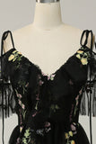 A-Line V-Neck Spaghetti Straps Embroidery Black Long Formal Dress with Slit