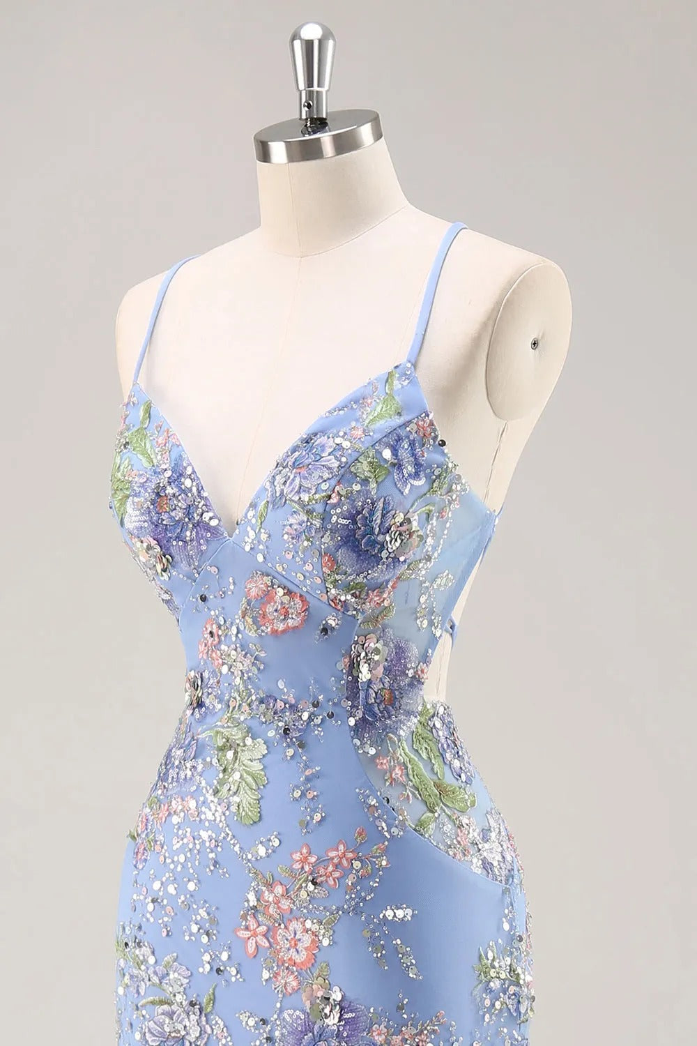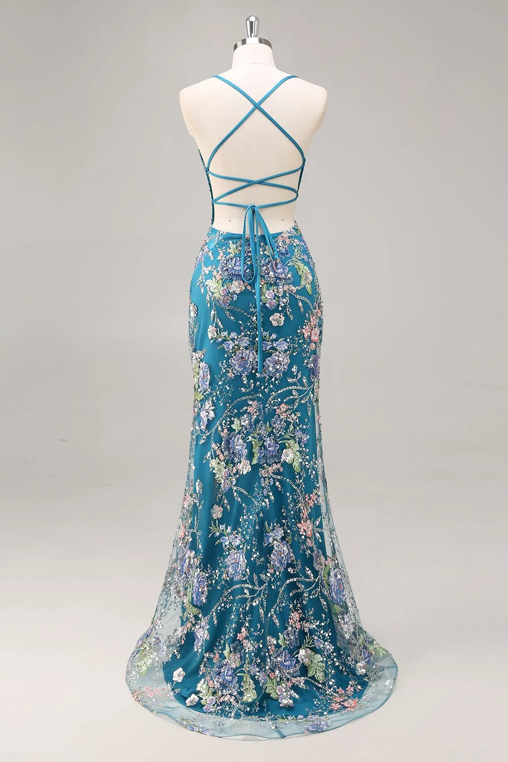 Sparkly Mermaid Spaghetti Straps Black Floral Long Formal Dress