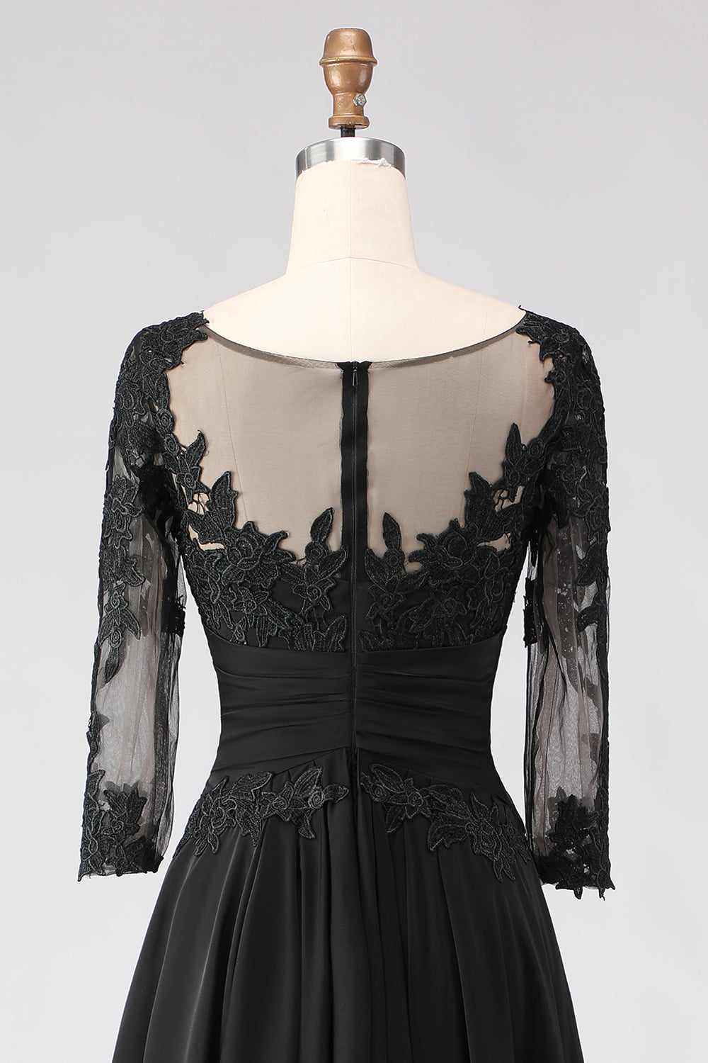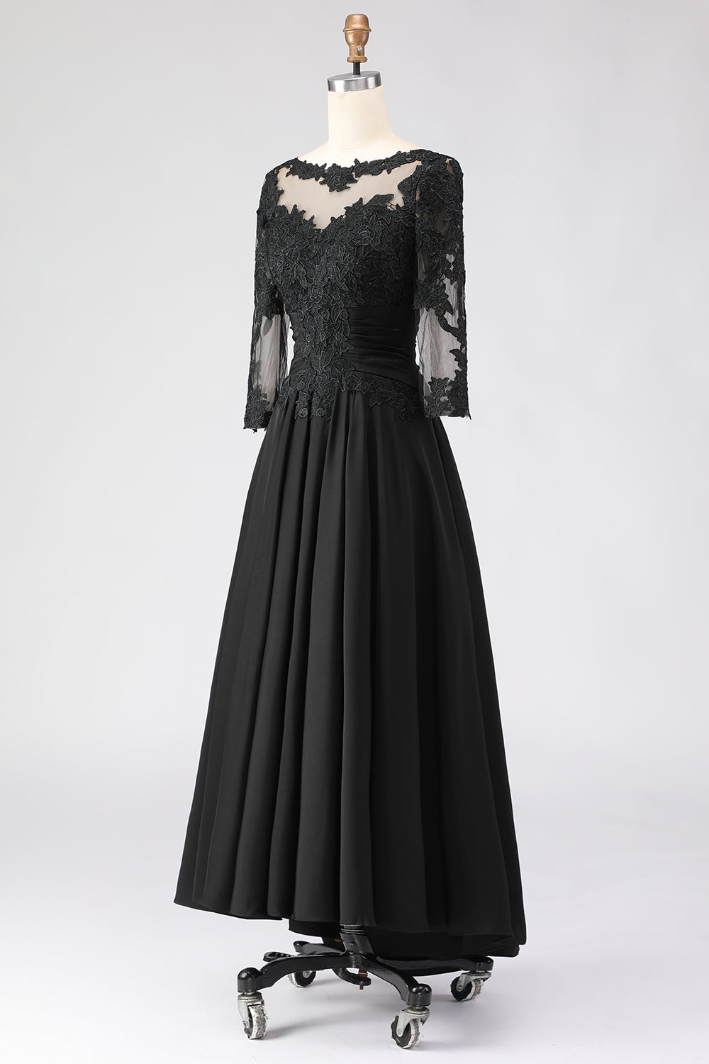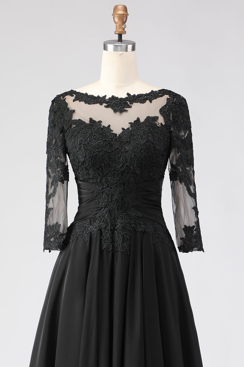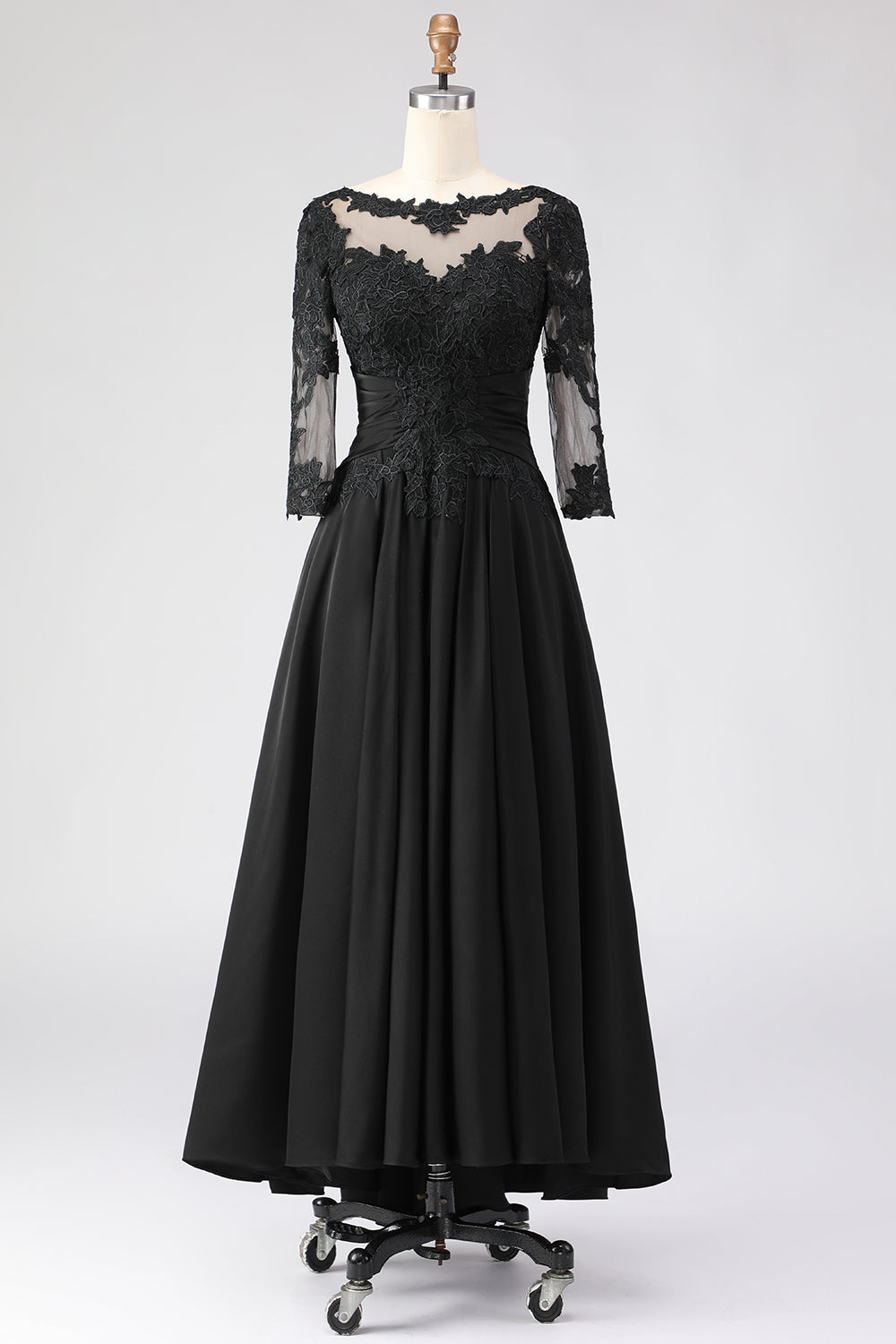 Black A Line Tea Length 3/4 Sleeve Mother of the Bride Dress with Appliques