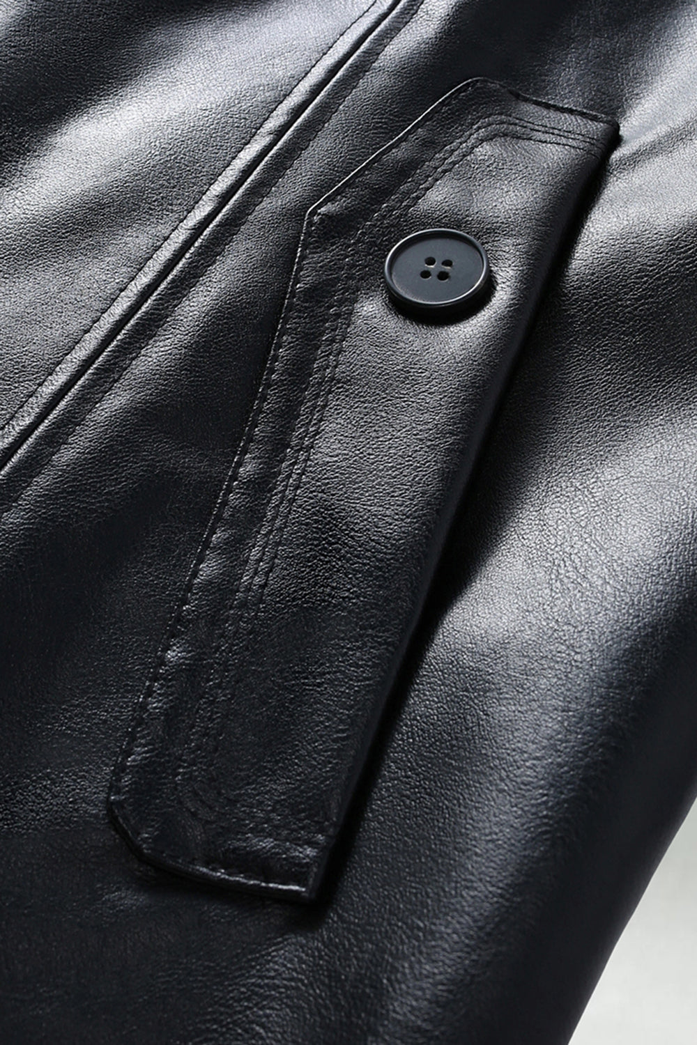 Black Leather Notched Lapel Men's Trench Coat with Belt