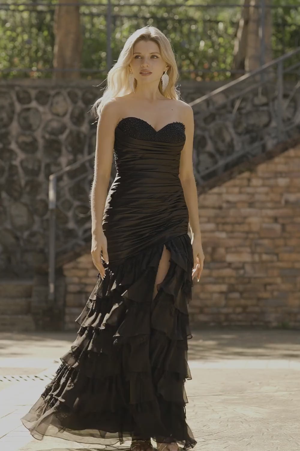 Black Mermaid Tiered Ruffle Sweetheart Ruched Long Prom Dress with Slit
