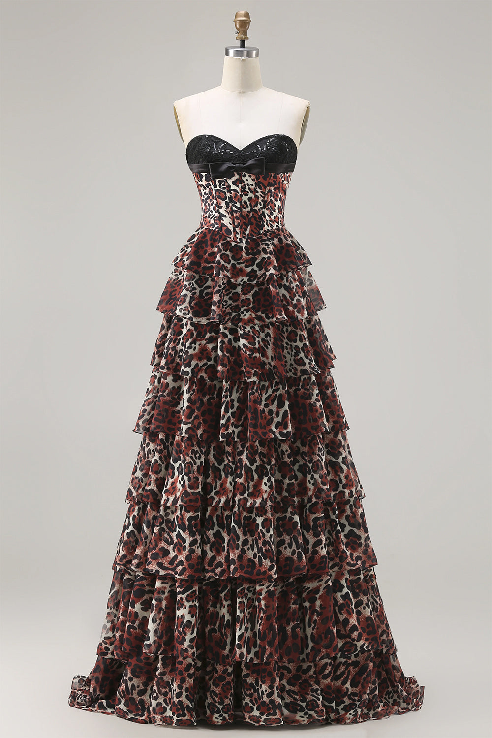 Brown Leopard A-Line Sweetheart Corset Tiered Long Prom Dress with Ruffles