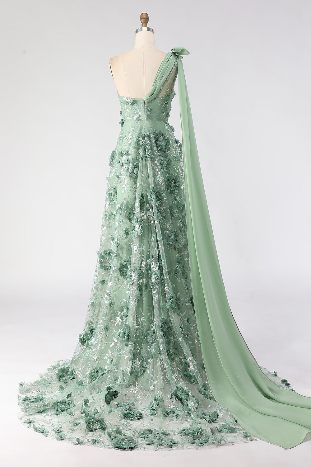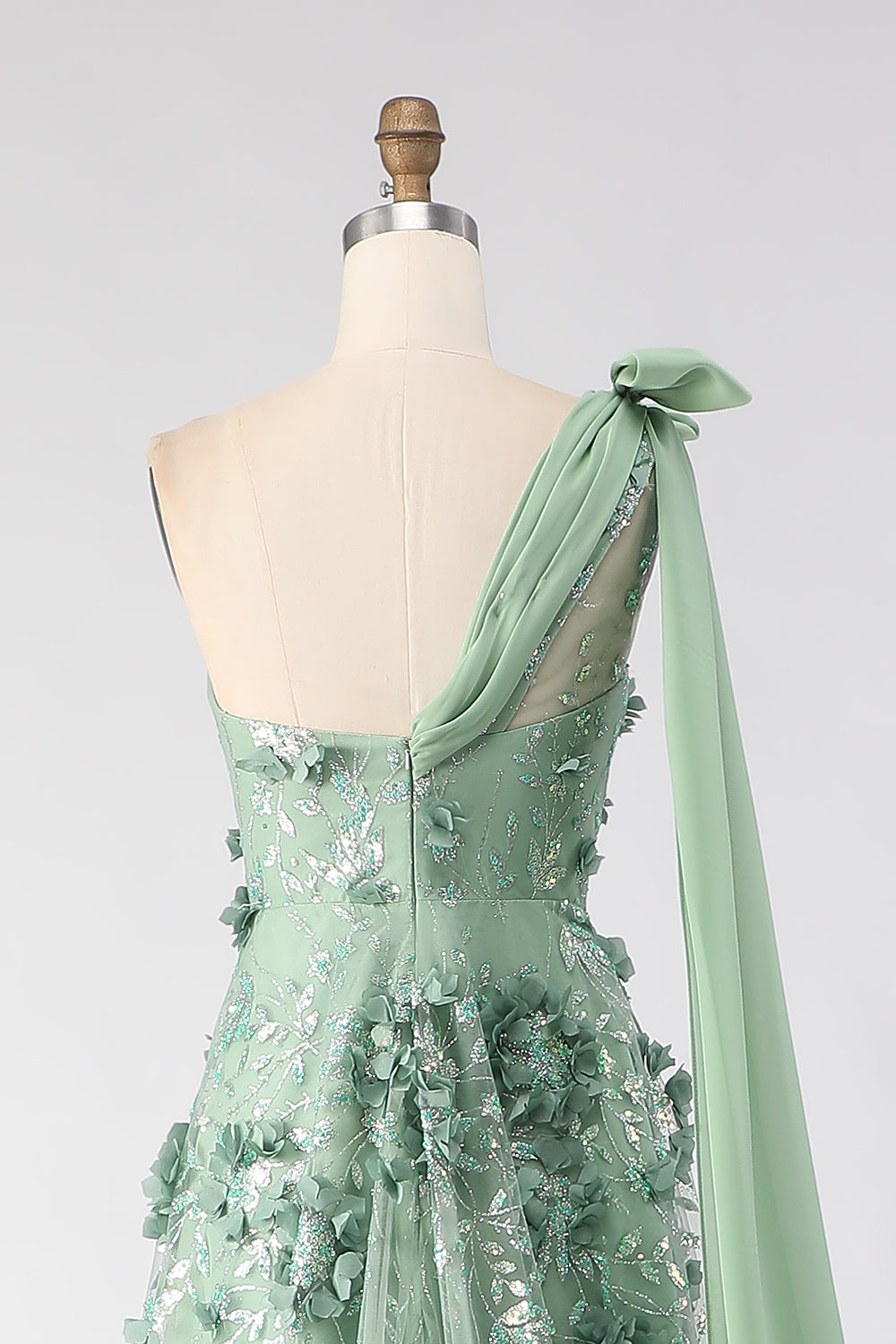 Eucalyptus One Shoulder A-Line Sequins 3D Flowers Long Prom Dress with Slit