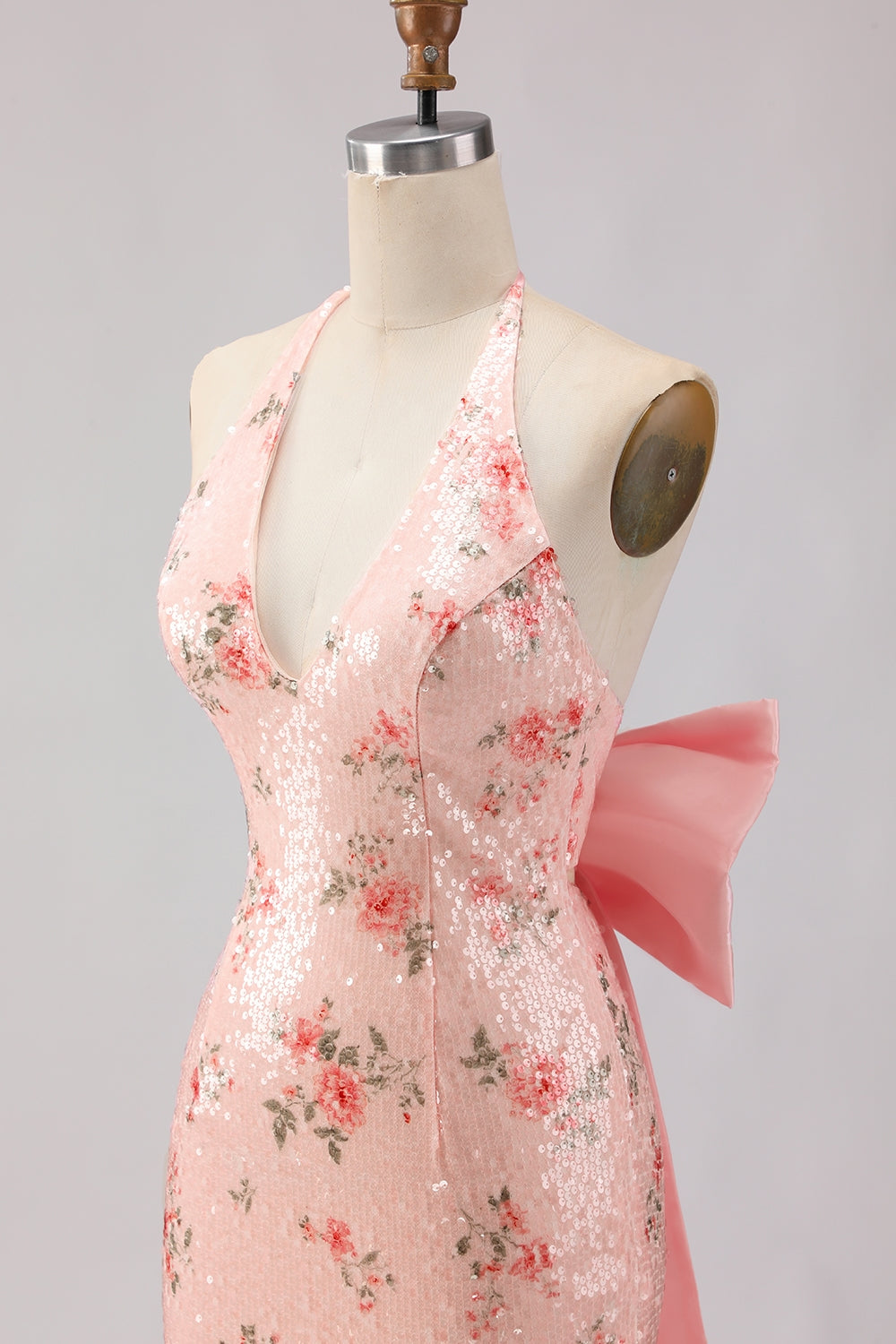 Sparkly Blush Halter Mermaid Side Slit Sequin Long Prom Dress with Large Bow