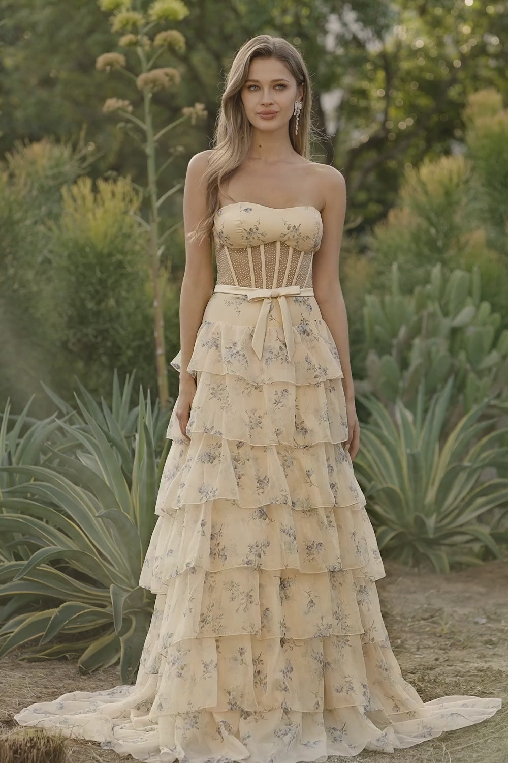 Strapless A Line Yellow Floral Beaded Corset Long Prom Dress with Ruffles