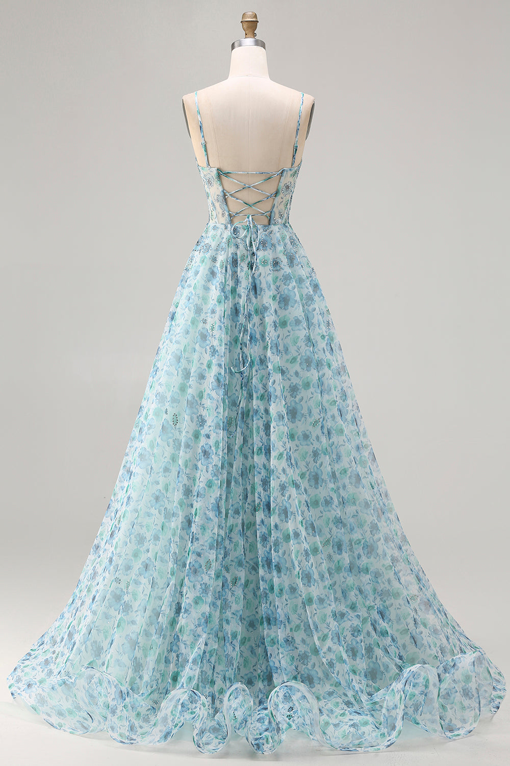 Strapless Blue Floral A-Line Beaded Convertible Long Prom Dress with Slit