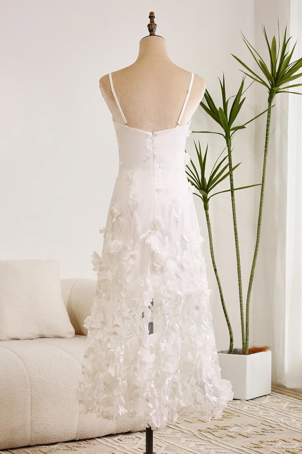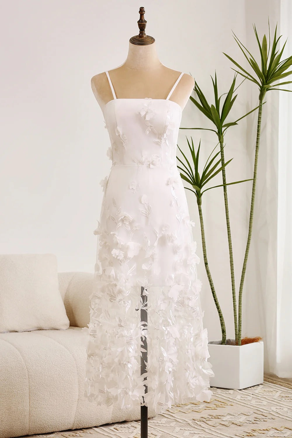 White Sheath Spaghetti Straps Long Engagement Party Dress with Flowers