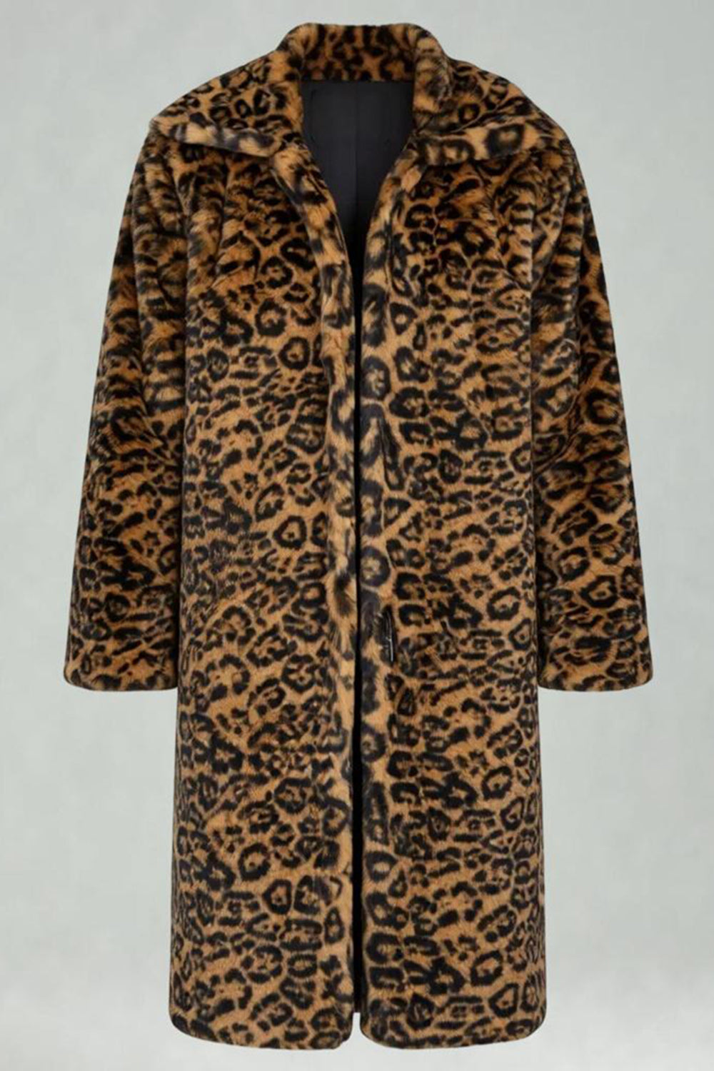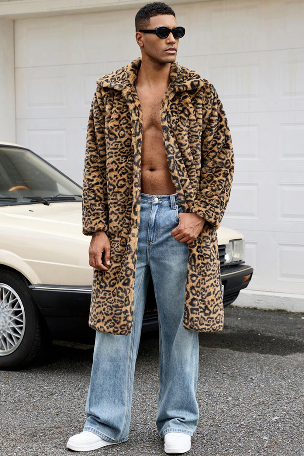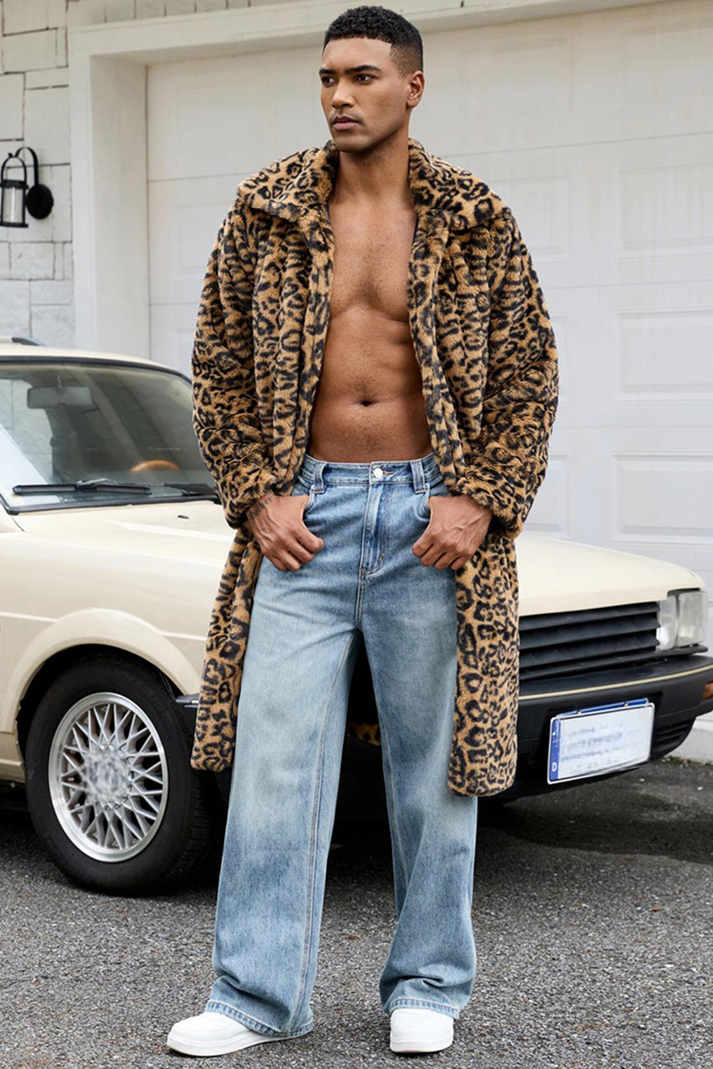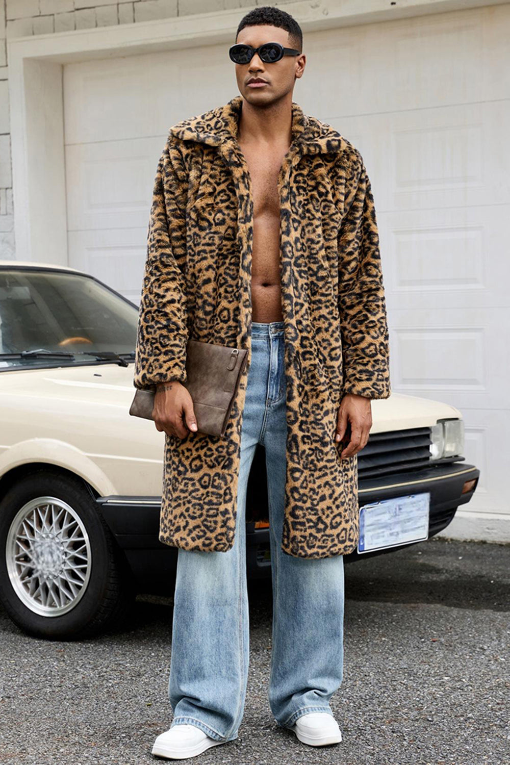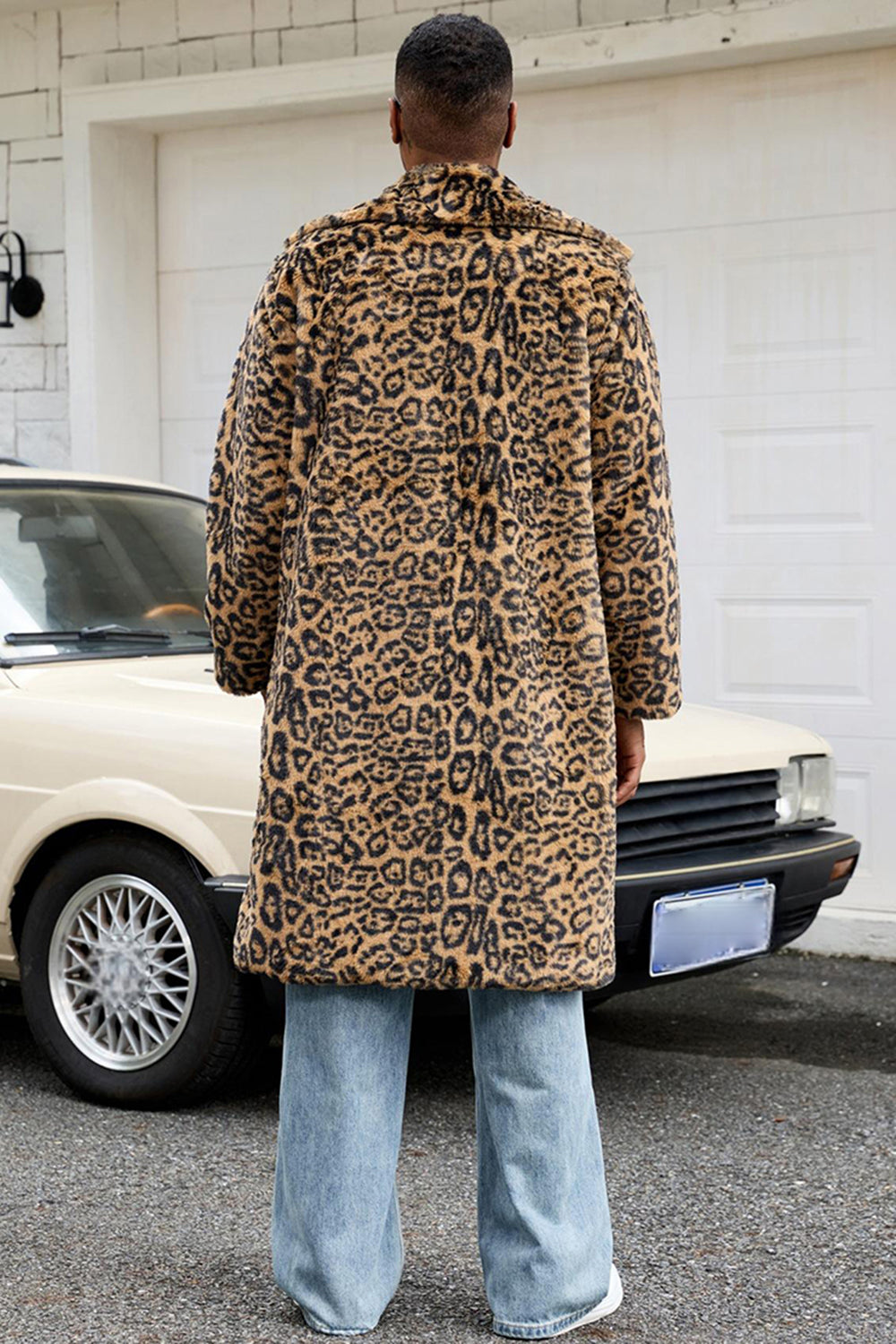 Yellow Leopard Faux Fur Open Front Warmth Men's Winter Coat