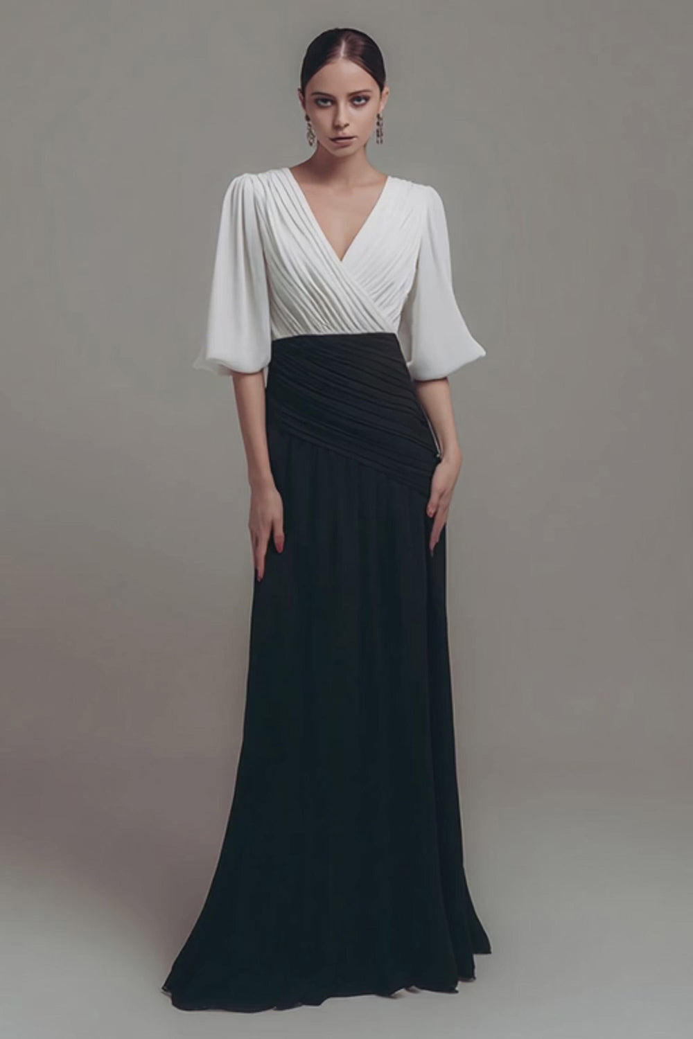 Black White Pleated V Neck A Line Long Formal Dress with Sleeves