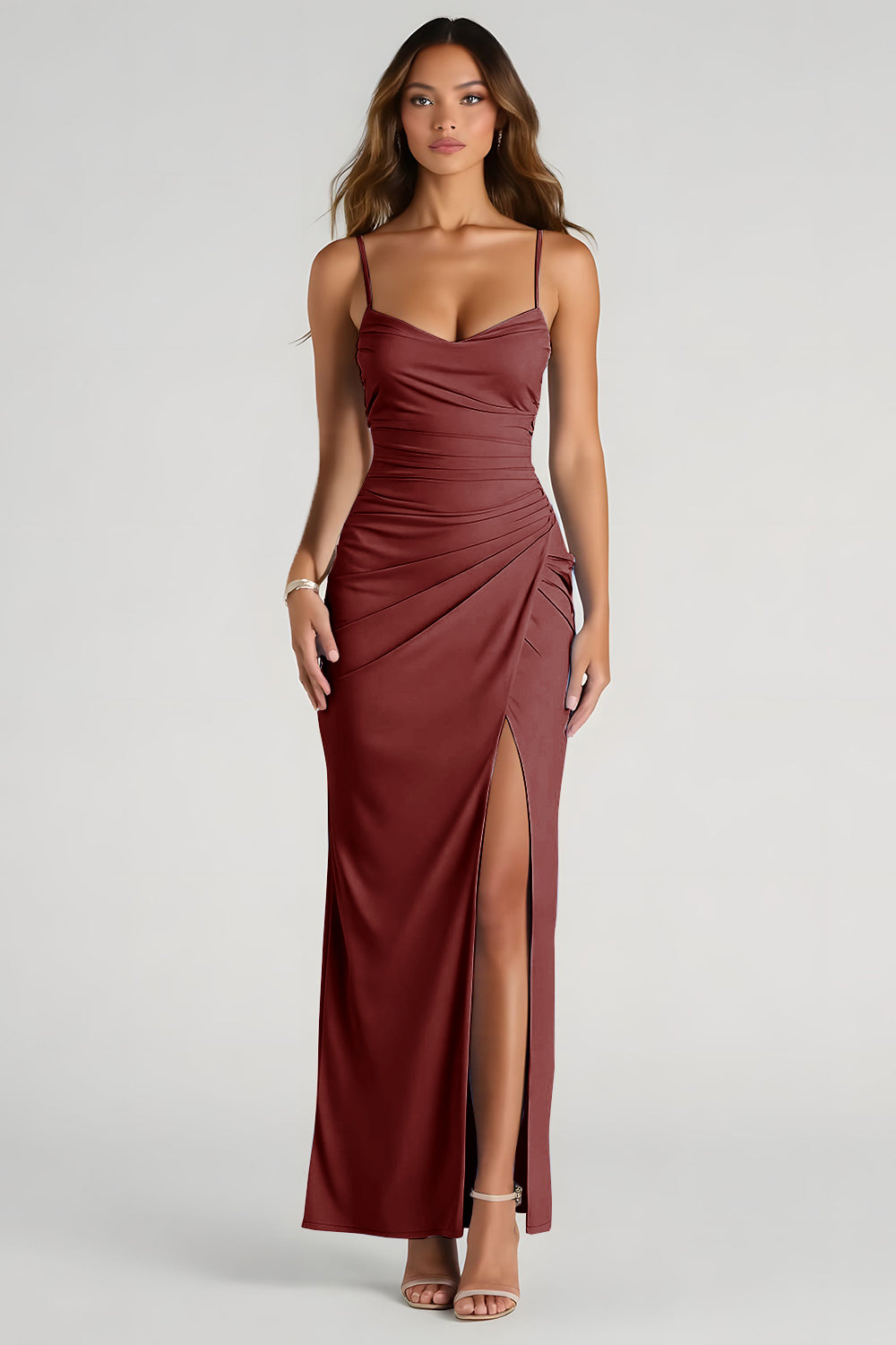 Light Blue Spaghetti Straps Sheath Ruched Long Bridesmaid Dress