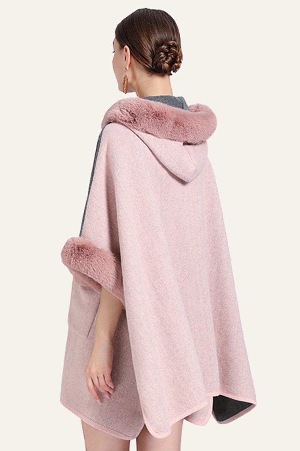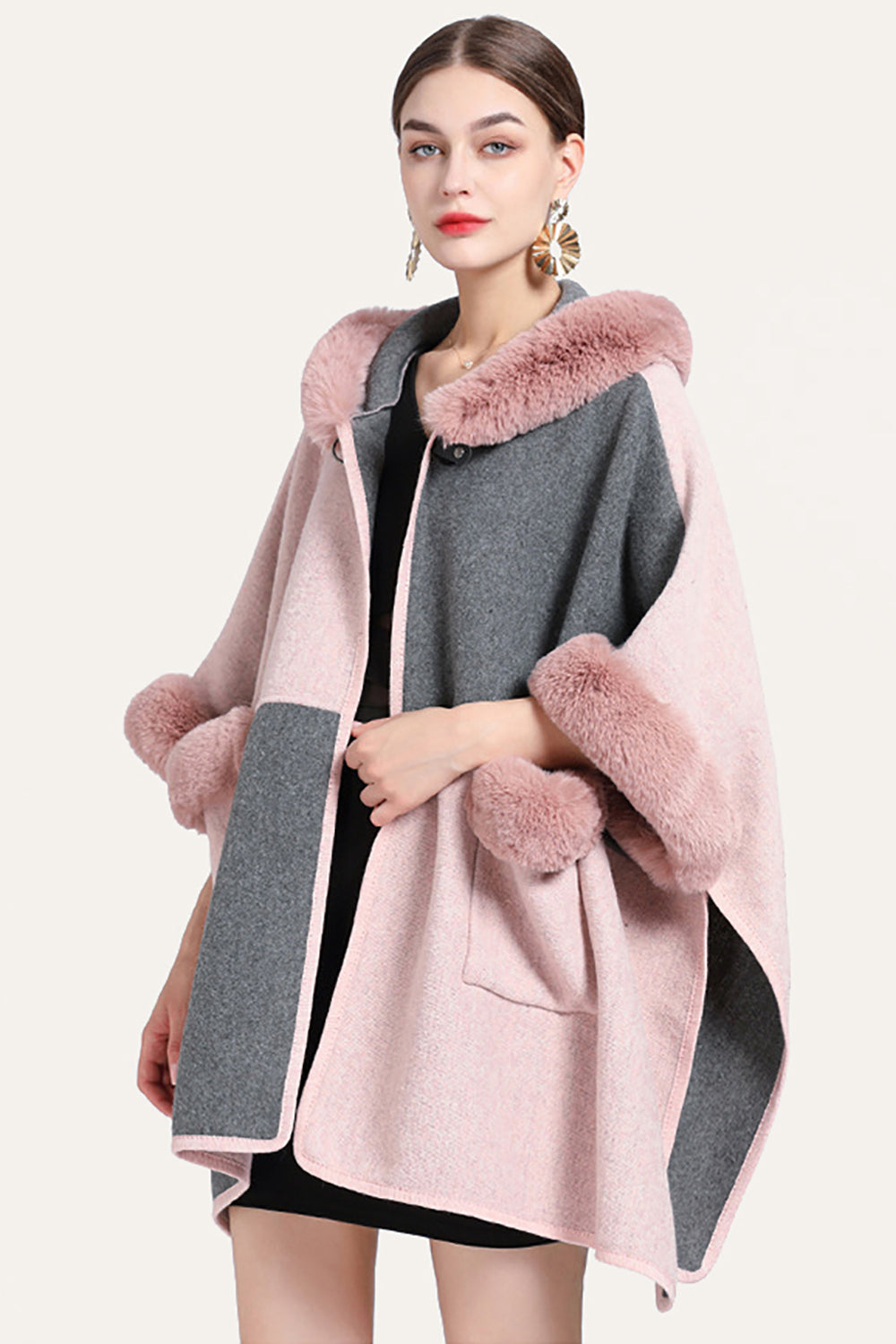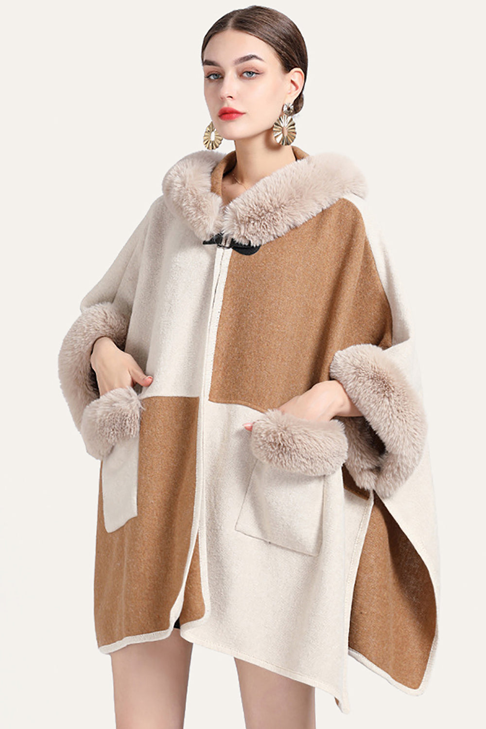 Camel Patchwork Oversized Faux Fur Trim Cape Coat