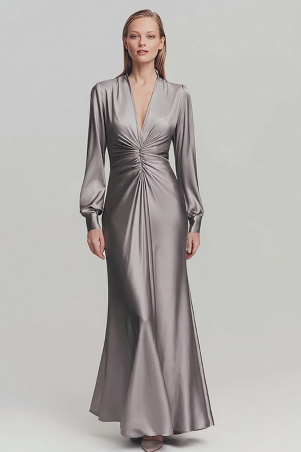 Grey Satin V Neck Long Formal Dress with Sleeves