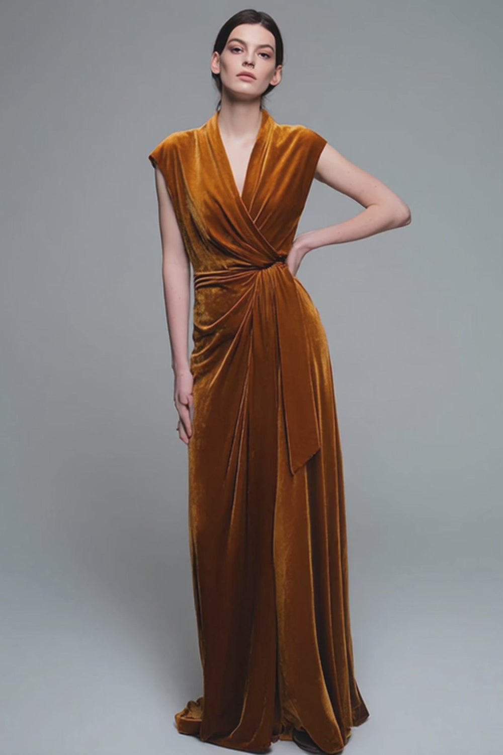 Caramel V Neck Velvet Sheath Long Formal Dress with Sleeves