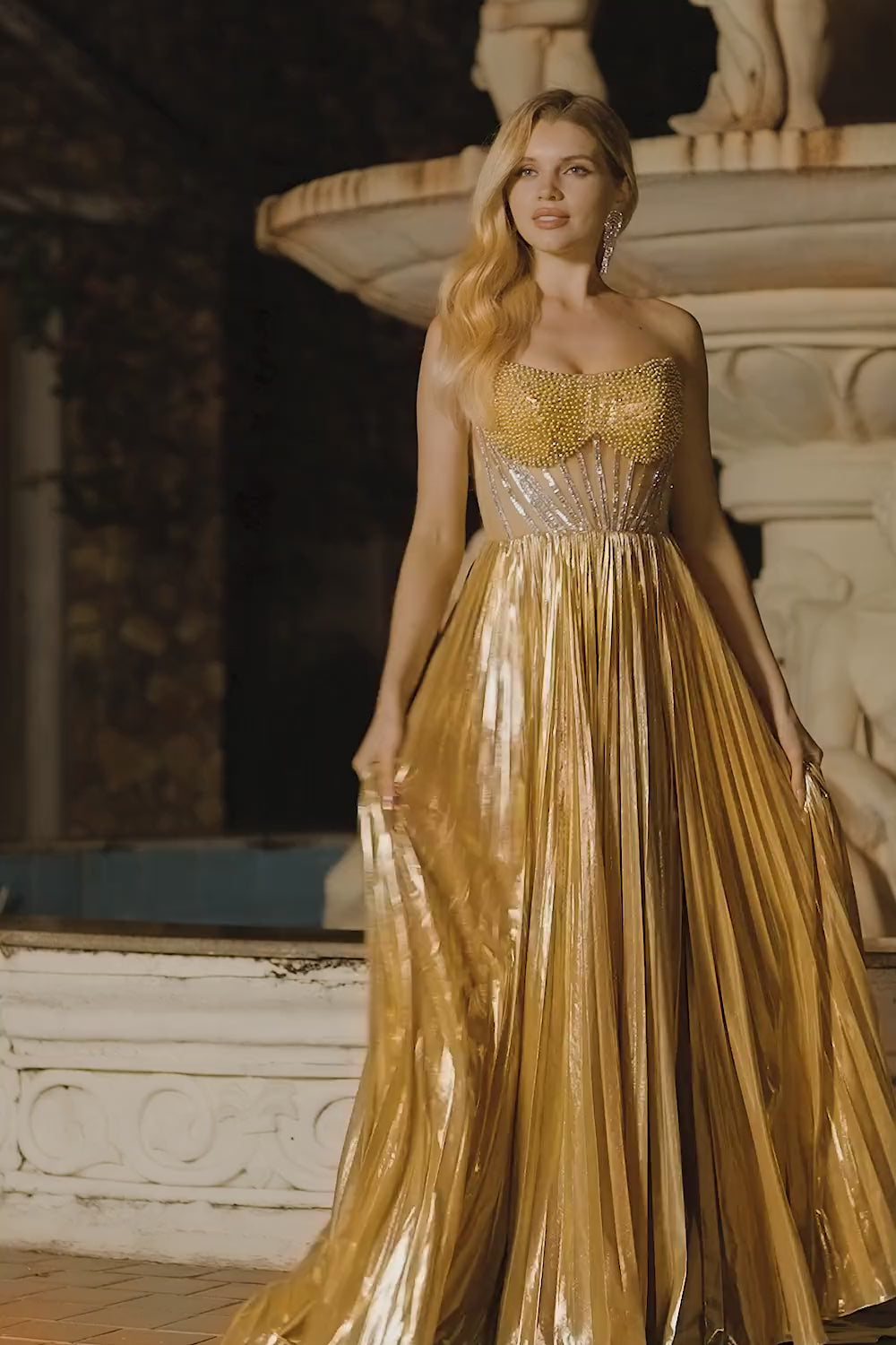 Metallic Golden Strapless Pleated A-Line Beaded Corset Long Prom Dress with Slit