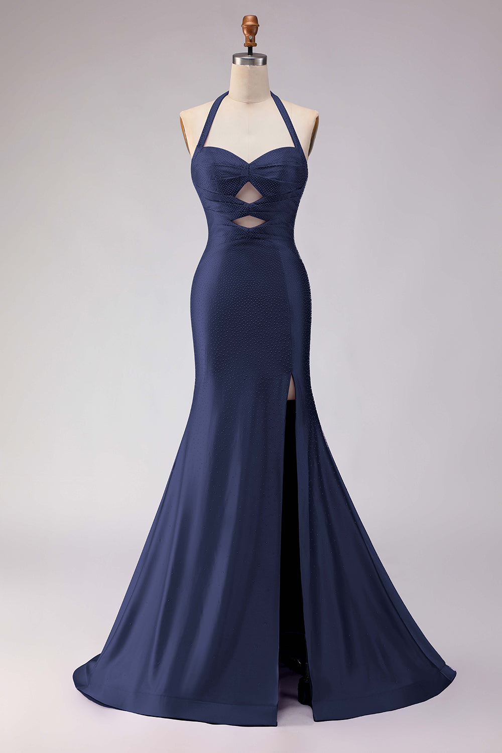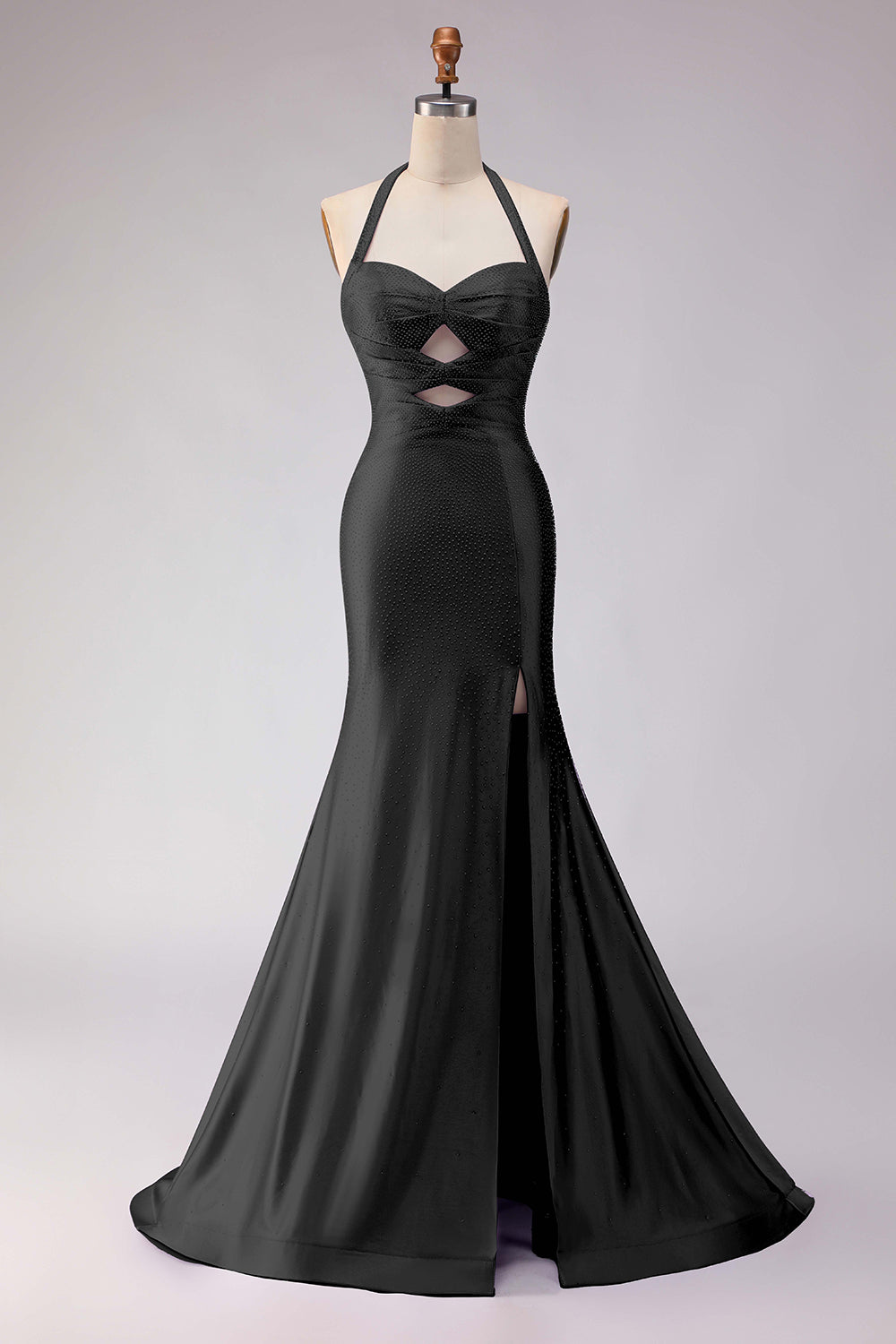Sparkly Beaded Mermaid Halter Lilac Satin Cut Out Long Formal Dress with Slit