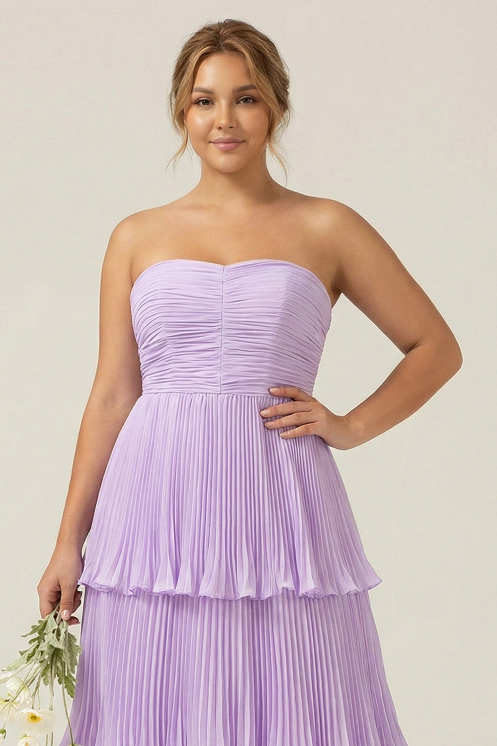 Strapless A-Line Lilac Pleated Chiffon Plus Size Long Bridesmaid Dress with Ruffles