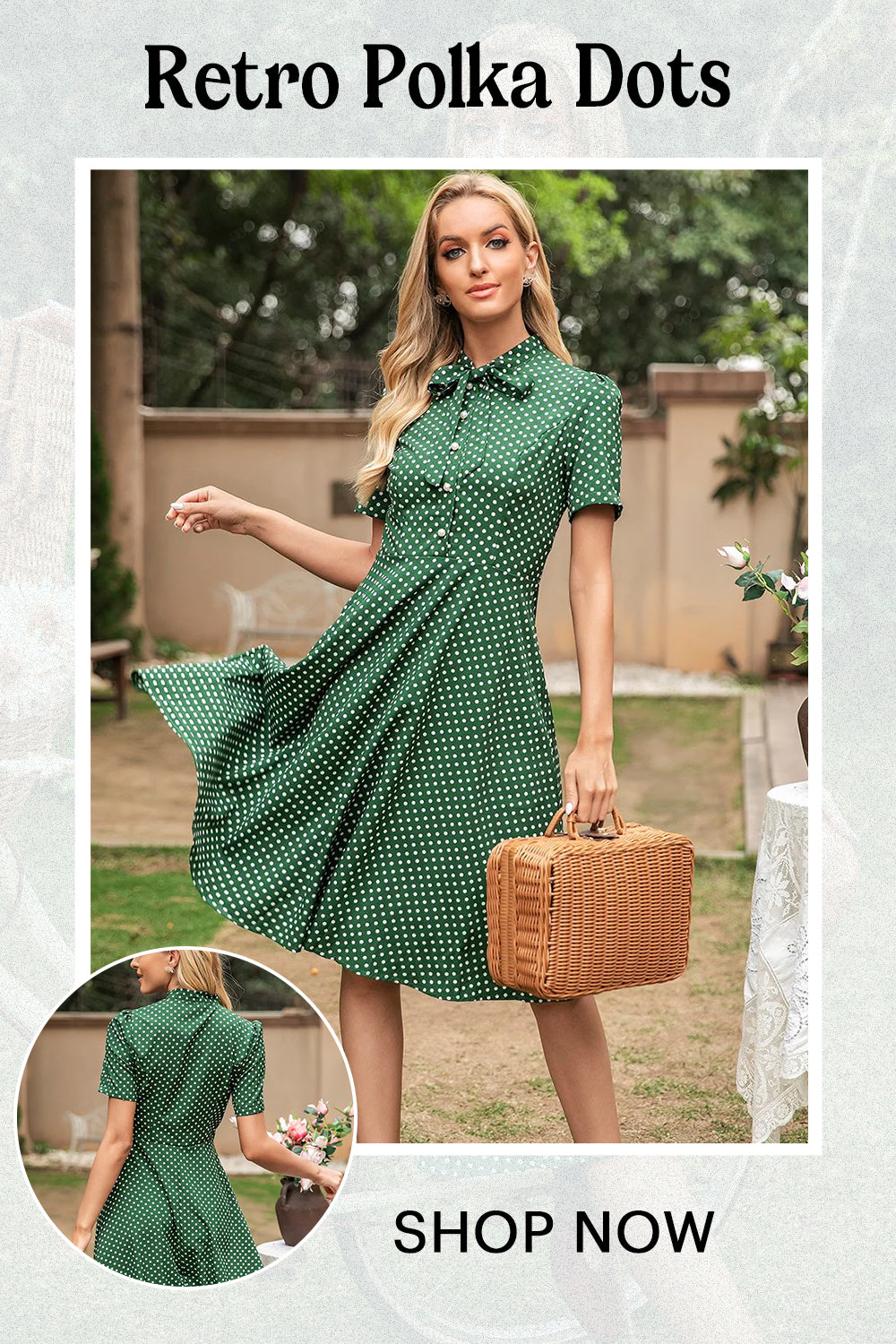 Green Lapel Neck Polka Dots Swing 1950s Dress