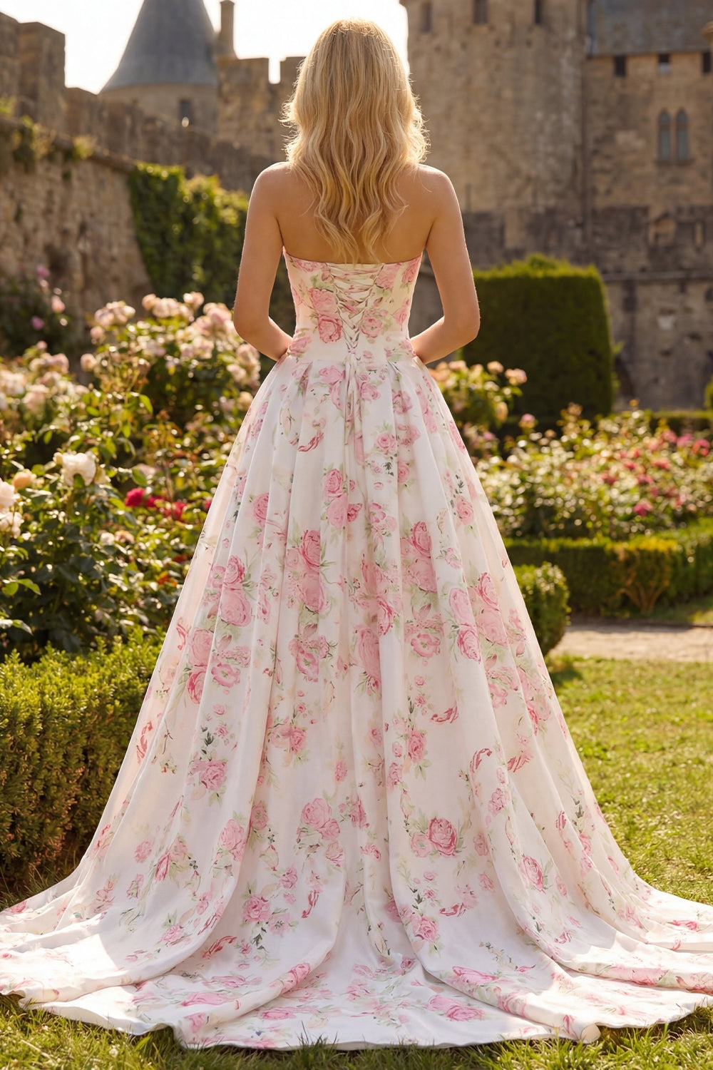 Black Pink Flower Printed A Line Strapless Long Formal Dress with Bow