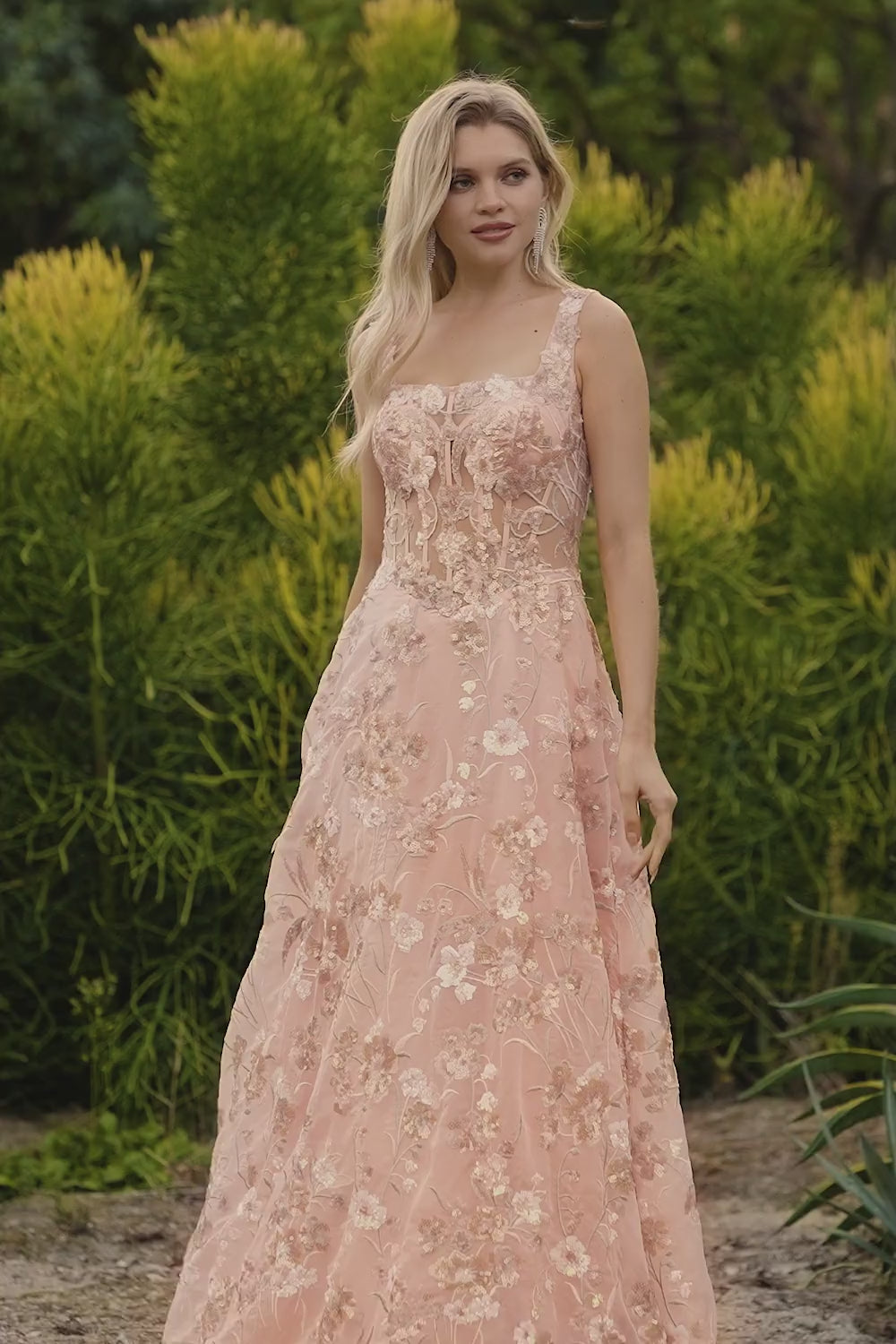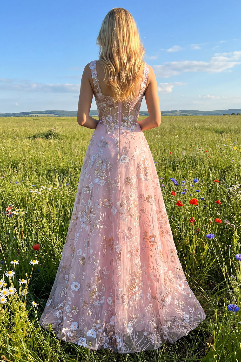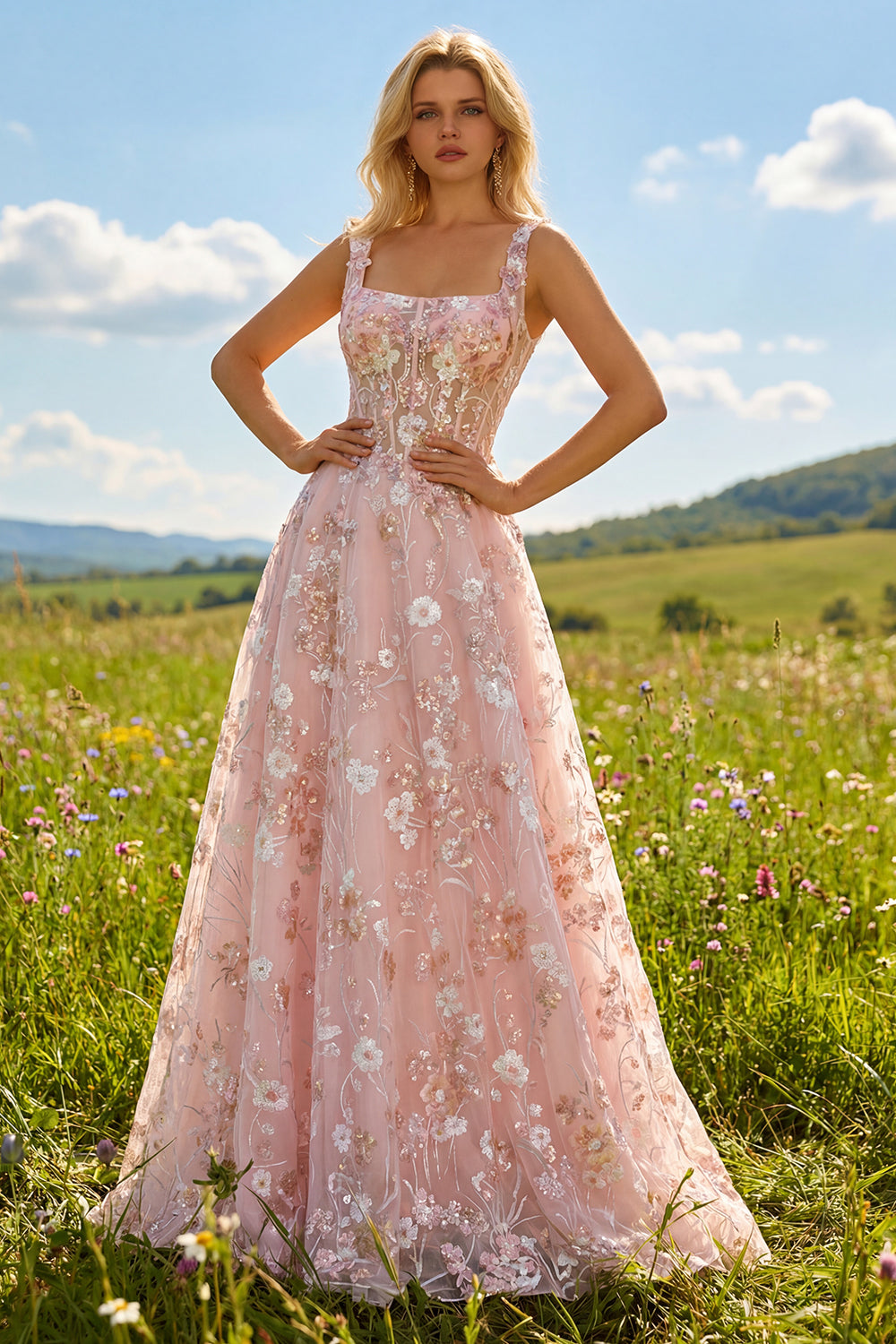 Pink Corset Sequin A Line Floral Long Prom Dress with Embroidery