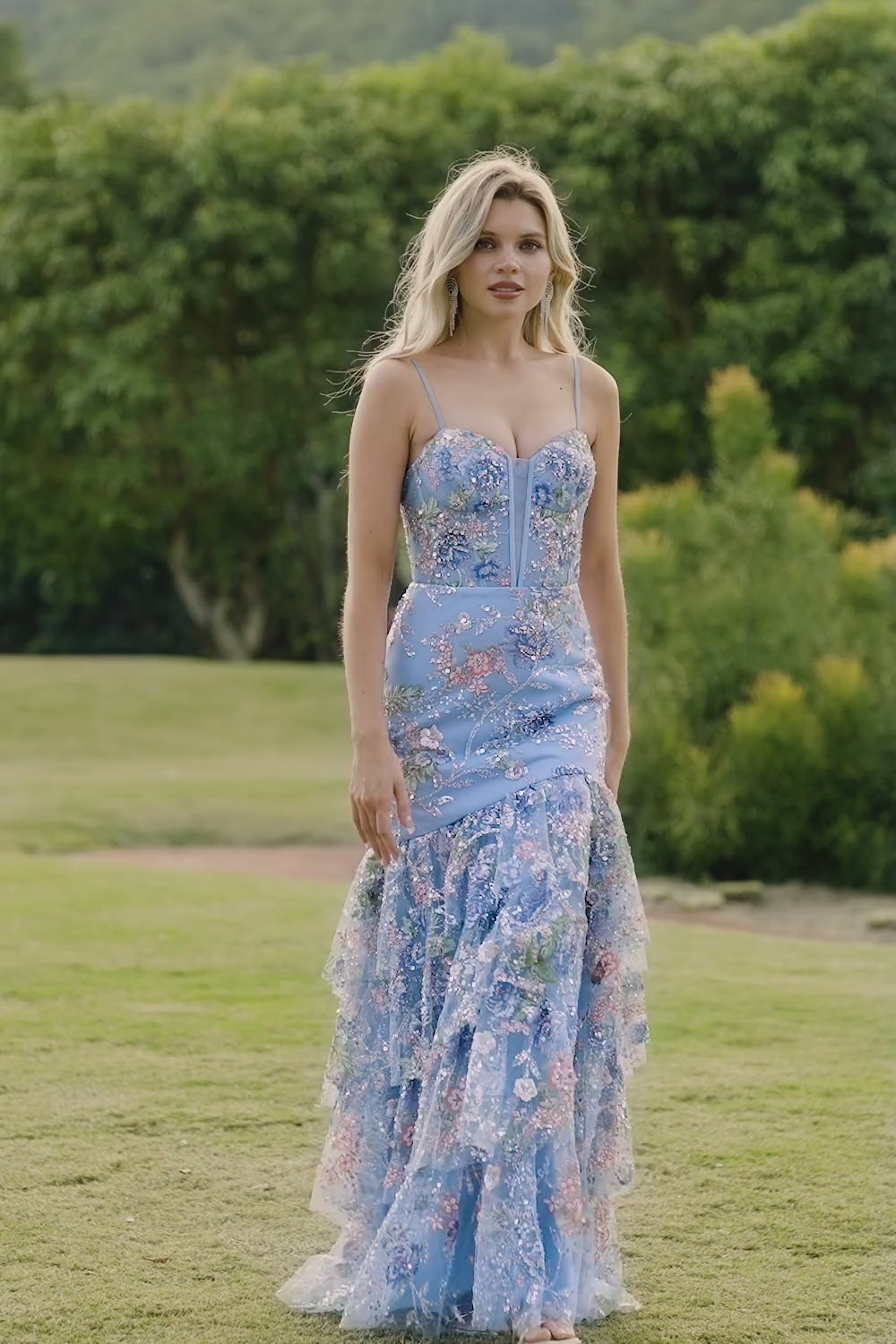 Pink Mermaid Sequin Floral Tiered Ruffle Long Prom Dress with Slit