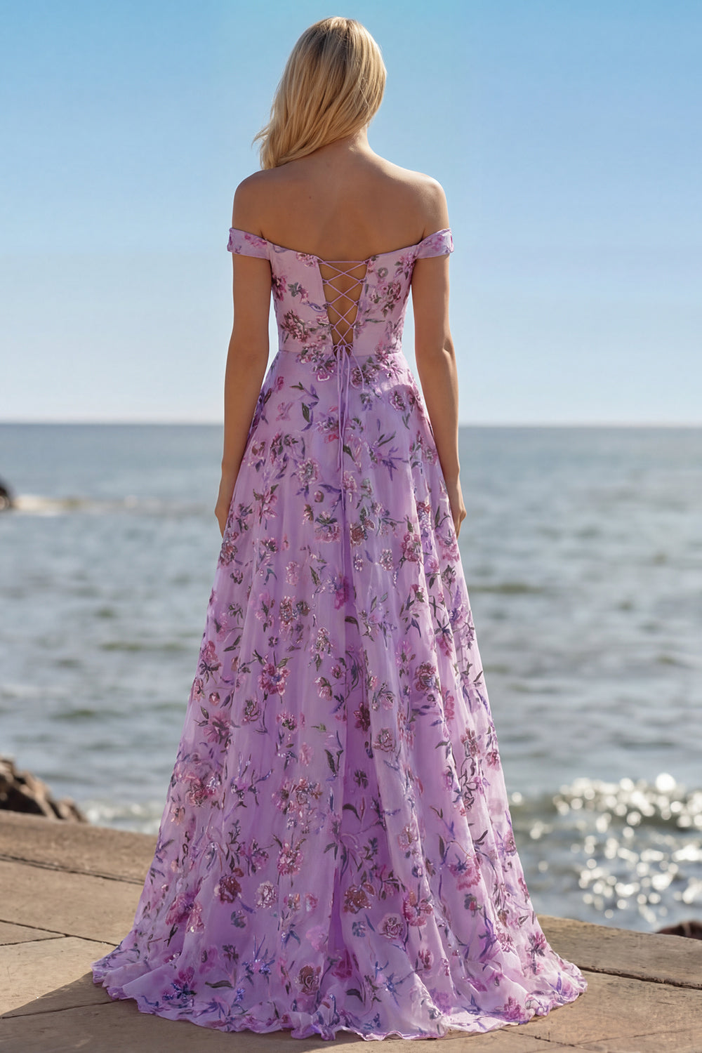 Purple Off The Shoulder Floral A-Line Sequin Long Prom Dress with Slit