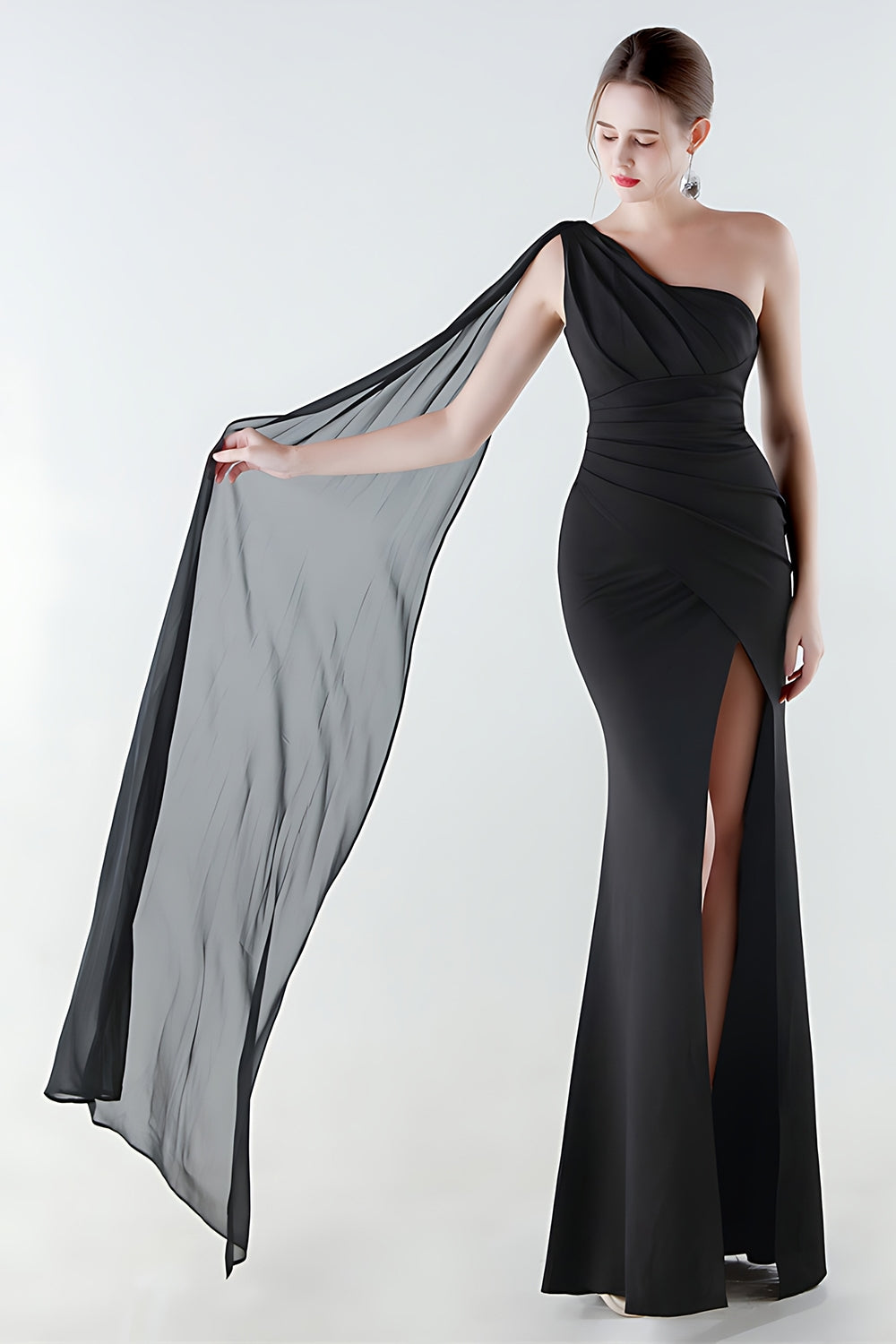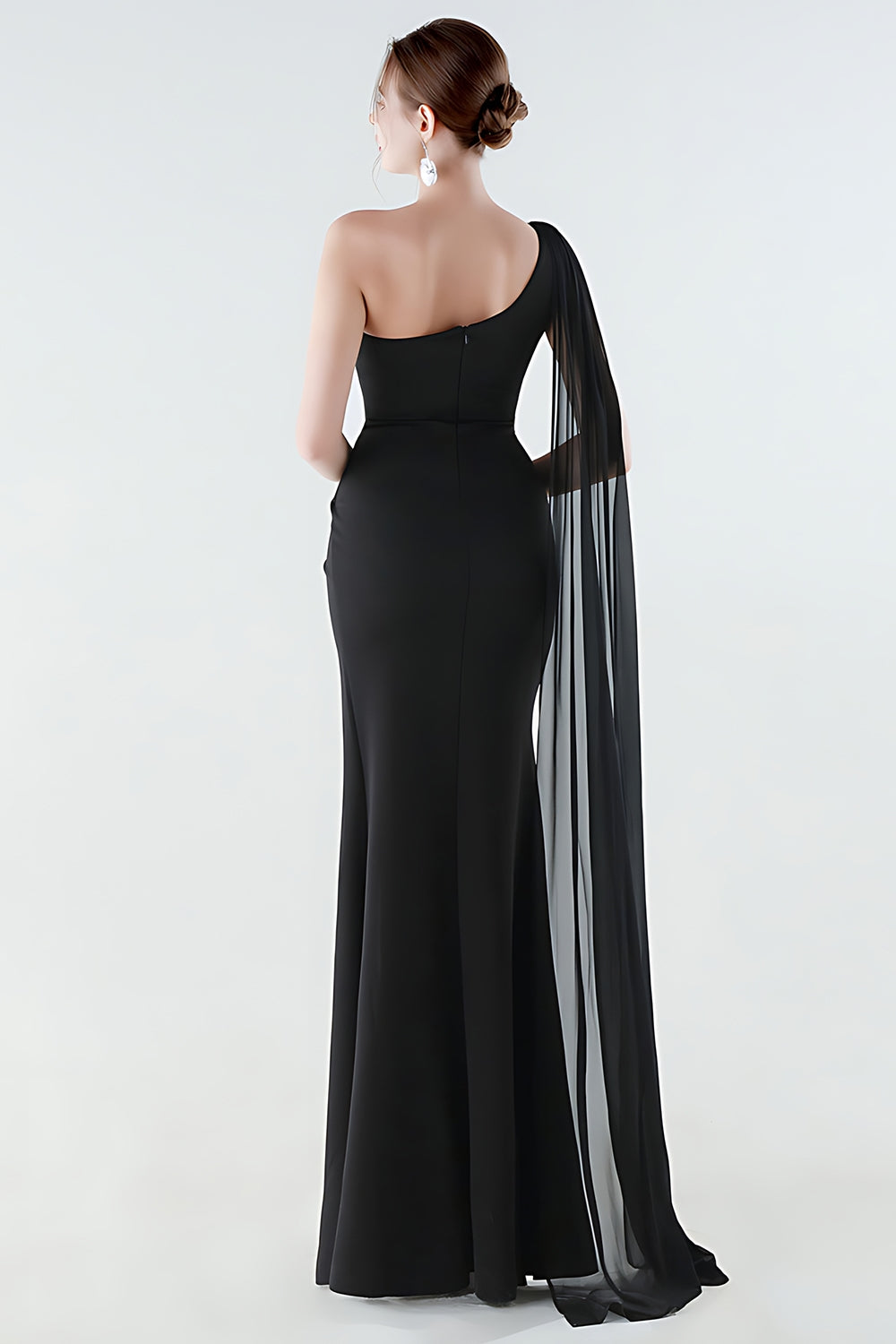 One Shoulder Mermaid Black Formal Dress with Streamer