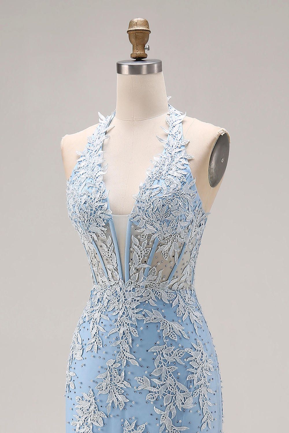 Sky Blue Halter Mermaid Beaded Corset Applique Long Prom Dress with Slit