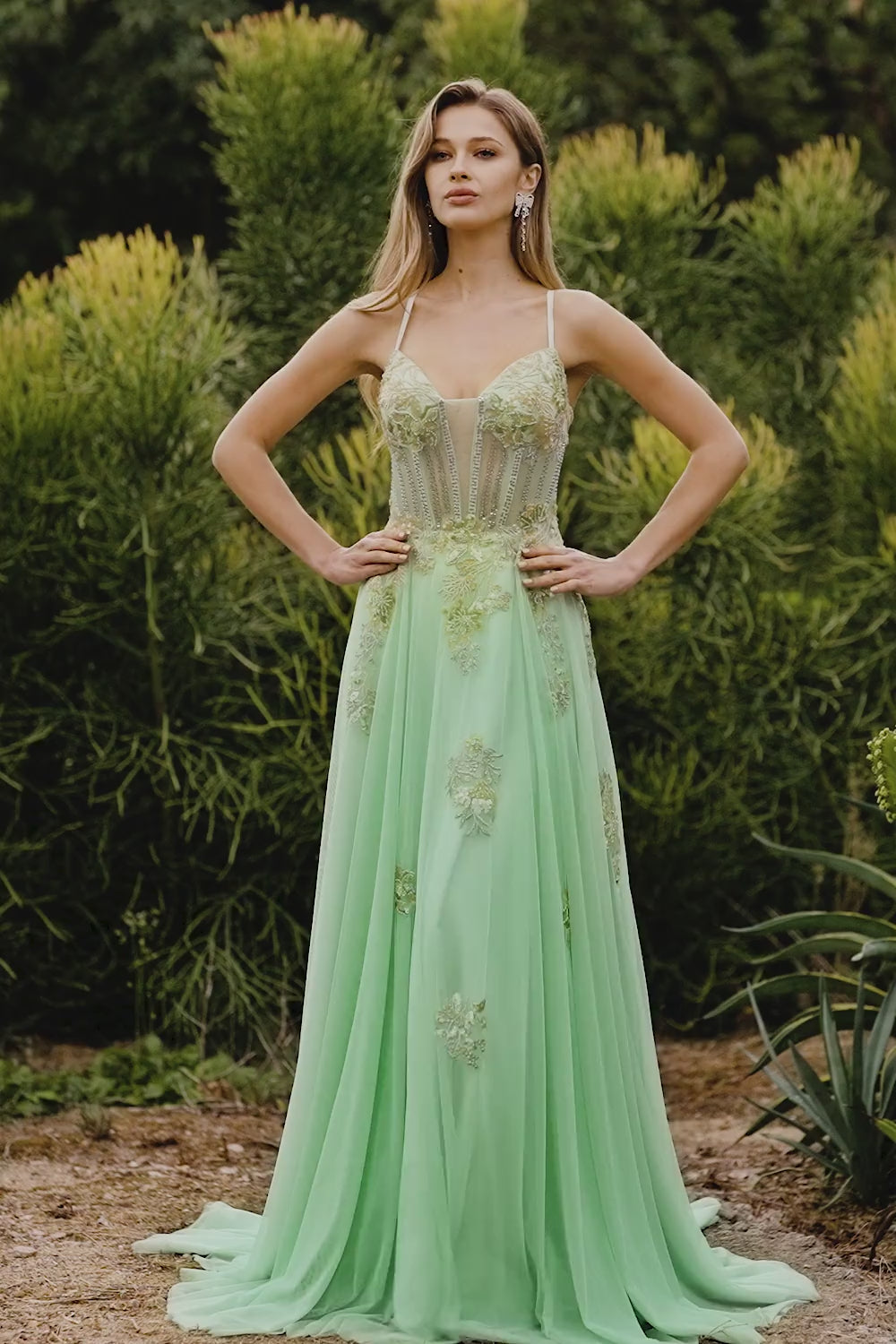 Green A Line Appliqued Beaded Long Corset Formal Dress