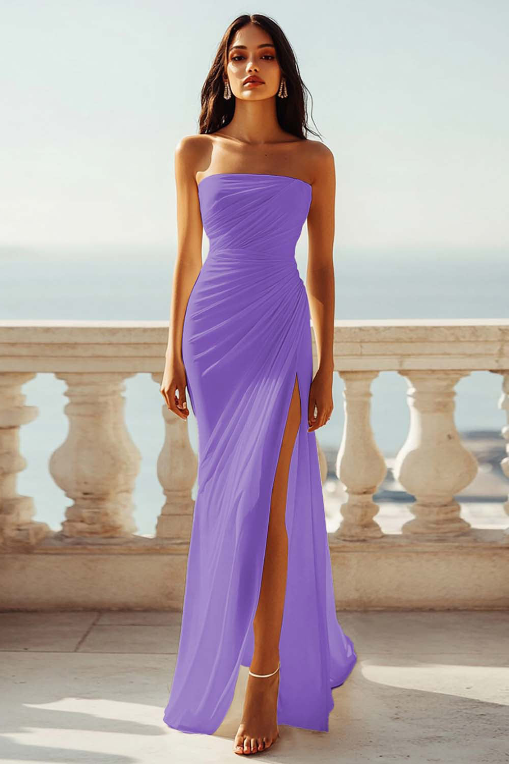 Chiffon Ivory Ruched Strapless Long Boho Formal Dress with Slit
