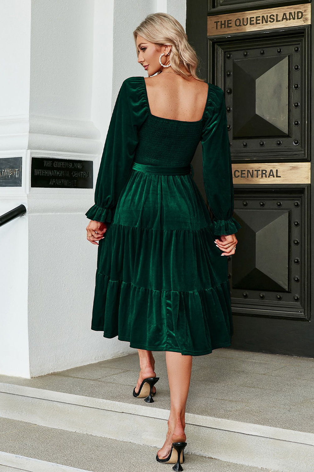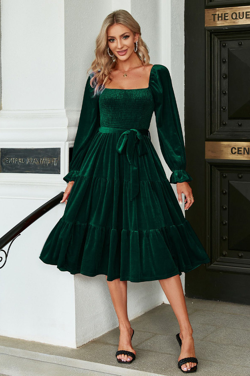 Dark Green Velvet Square Neck Holiday Party Dress