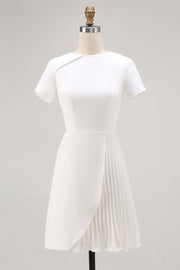 Ivory Satin A Line Pleated Short Work Dress with Short Sleeves