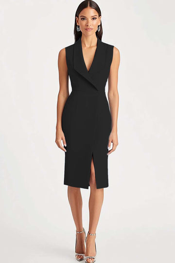 Black Pencil Shawl Lapel Midi Work Dress with Slit