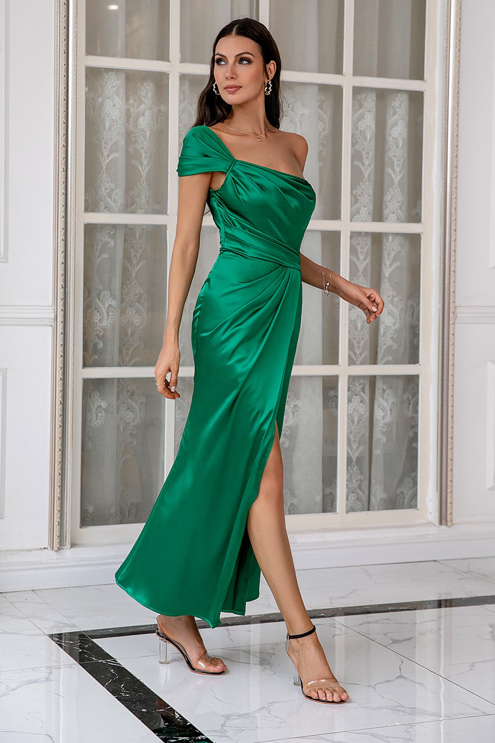 One Shoulder Dark Green Party Dress with Split Front