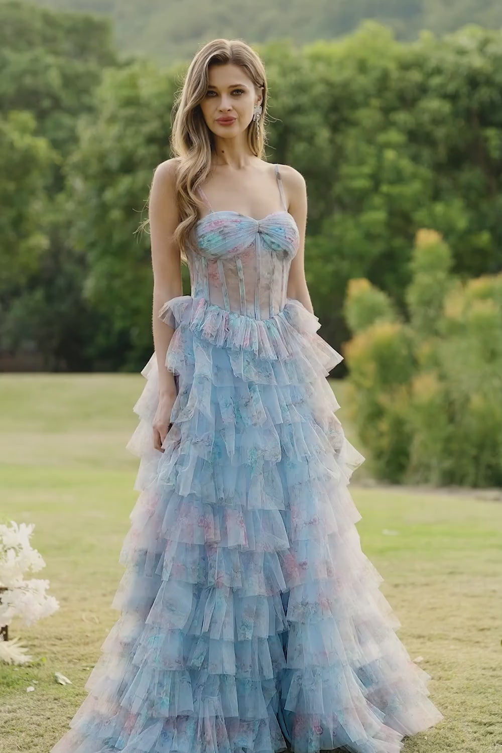 Blue Floral Tulle Ball Gown Tiered Ruffle Corset Long Formal Dress with Slit