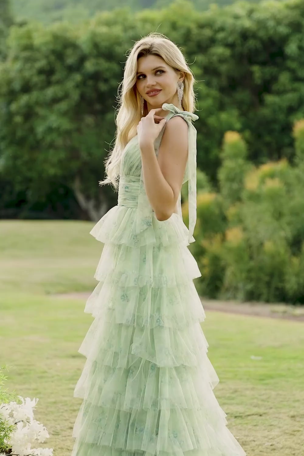 Green Floral A Line Tiered Ruffle V-Neck Long Formal Dress with Slit