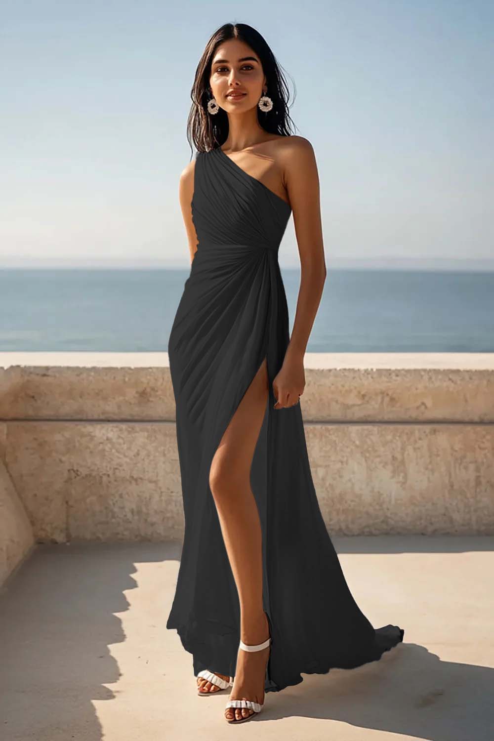Ivory One Shoulder Ruched Maxi Sheath Boho Formal Dress with Slit
