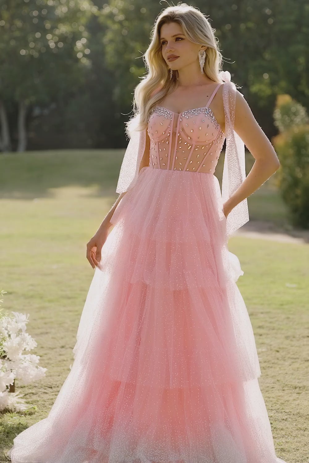 Sparkly Pink Corset Beaded A Line Ruffled Long Formal Dress with Bow