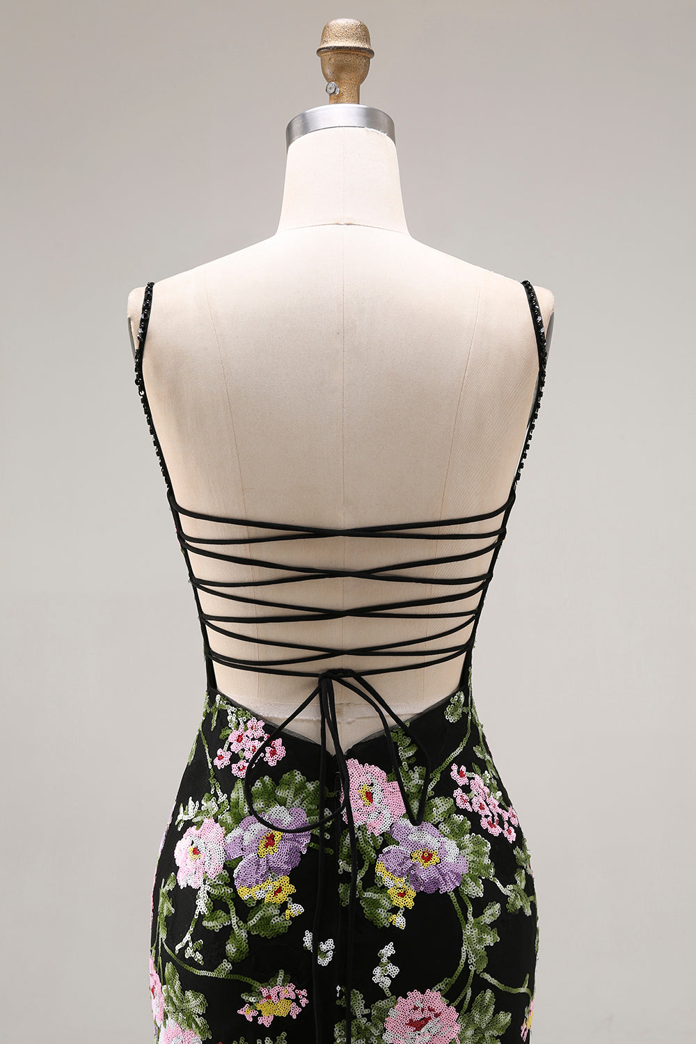 Black Pink Flower Mermaid Ruffled Sequin Long Prom Dress with Lace Up Back