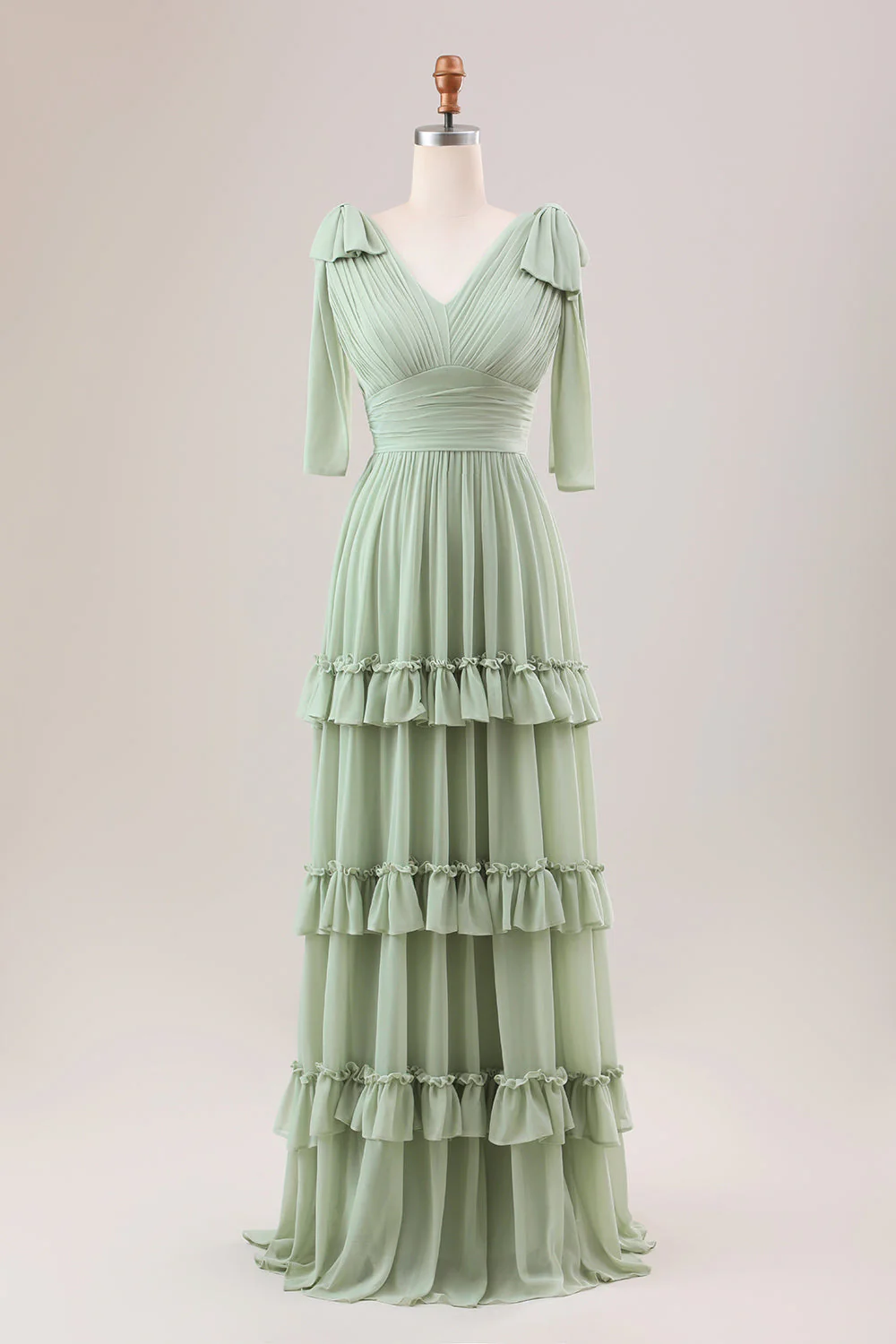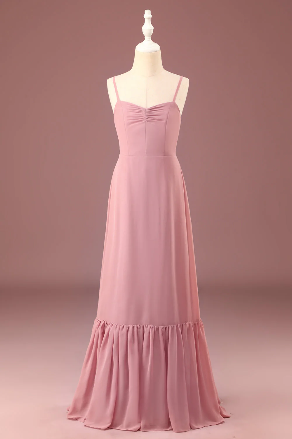 Matcha A Line Spaghetti Straps Long Bridesmaid Dress with Ruffles
