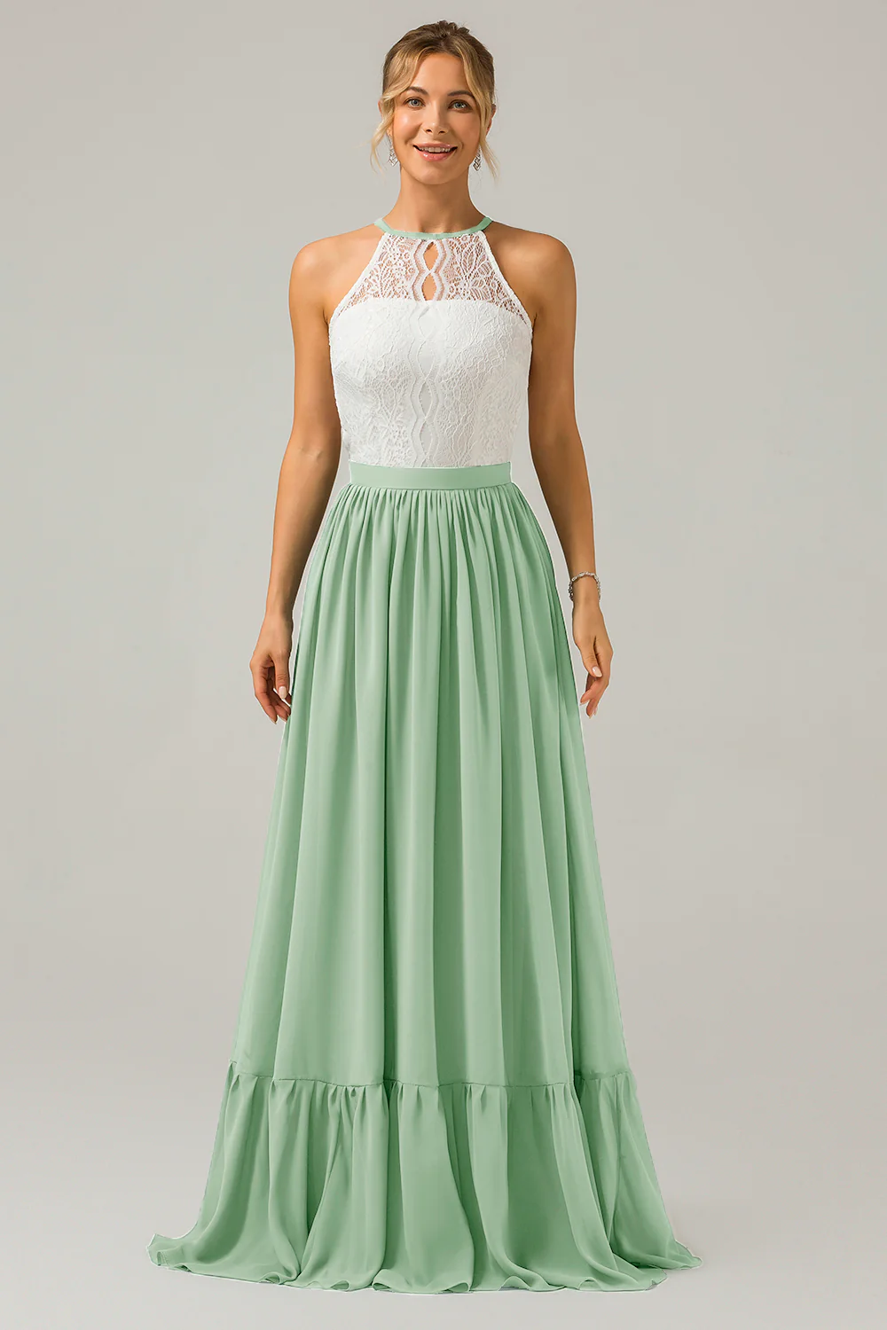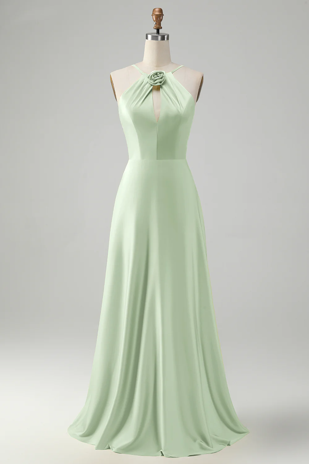 Halter A-Line Dusty Sage Cut Out Long Bridesmaid Dress with Flower