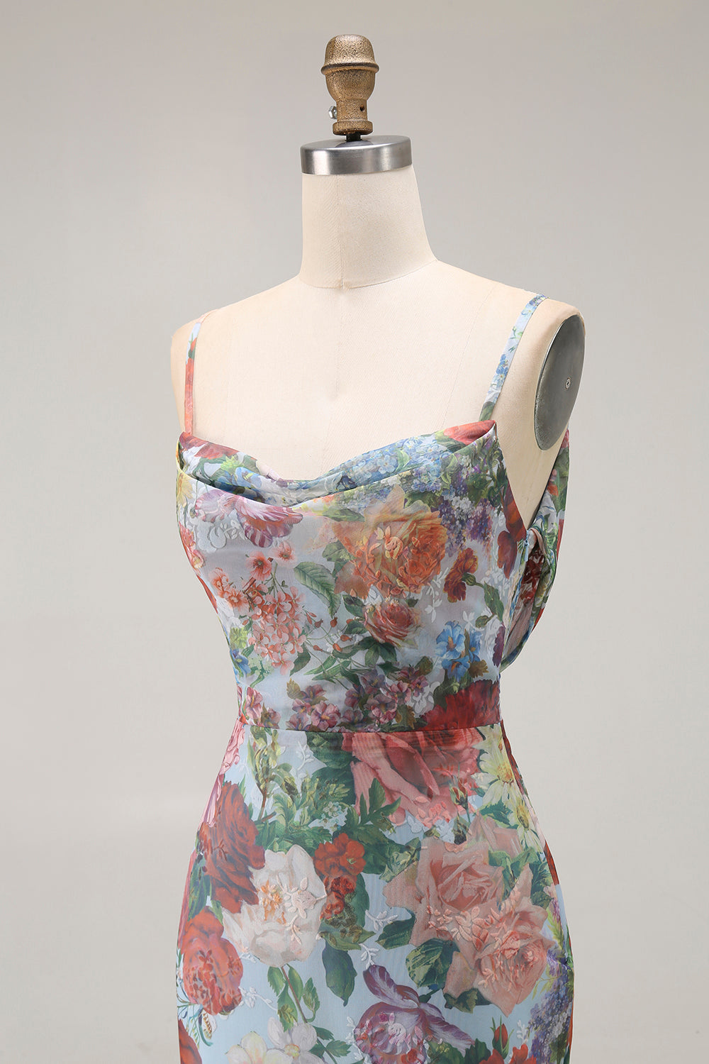 Blue Printed Sheath Spaghetti Straps Bridesmaid Dress With Slit
