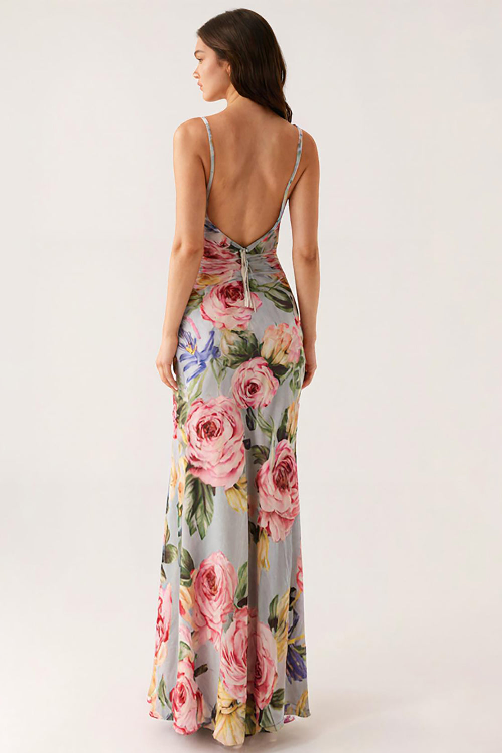 Grey Blue Floral Spaghetti Straps Mermaid Evening Dress